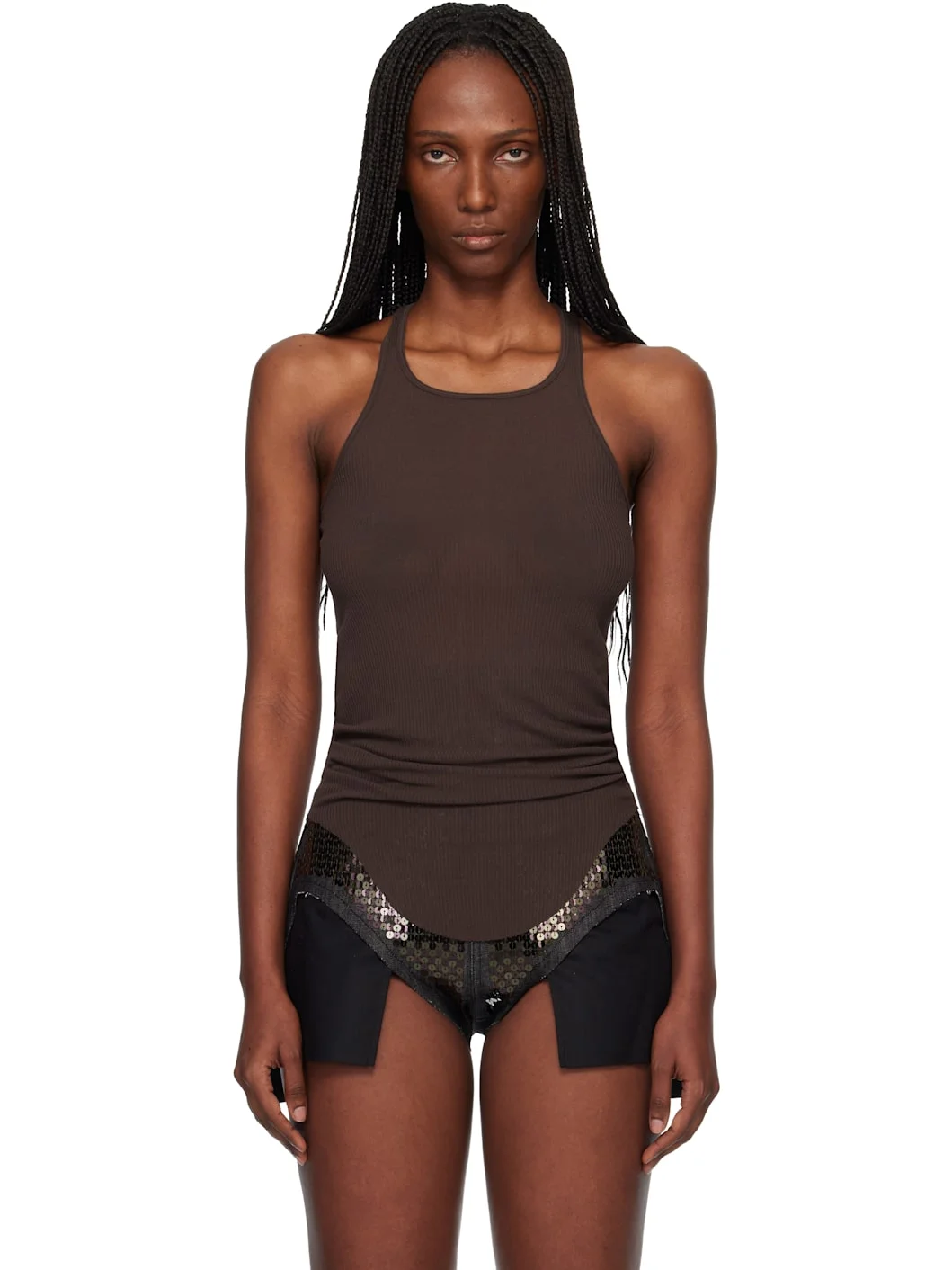 Semi-sheer rib-knit viscose- and silk-blend tank top. · FSC-certified viscose · Crewneck · Raw edge at curved hem · Central seam at back Supplier color: Macassar 88% viscose, 12% silk. Made in Italy 261232F111009