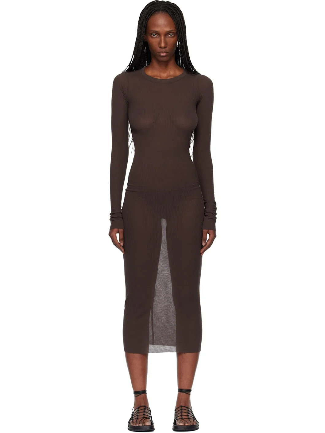 Semi-sheer rib-knit viscose- and silk-blend midi dress. · FSC-certified viscose · Crewneck · Raw edge at hem and cuffs · Central seam at back Supplier color: Macassar 88% viscose, 12% silk. Made in Italy 261232F054017
