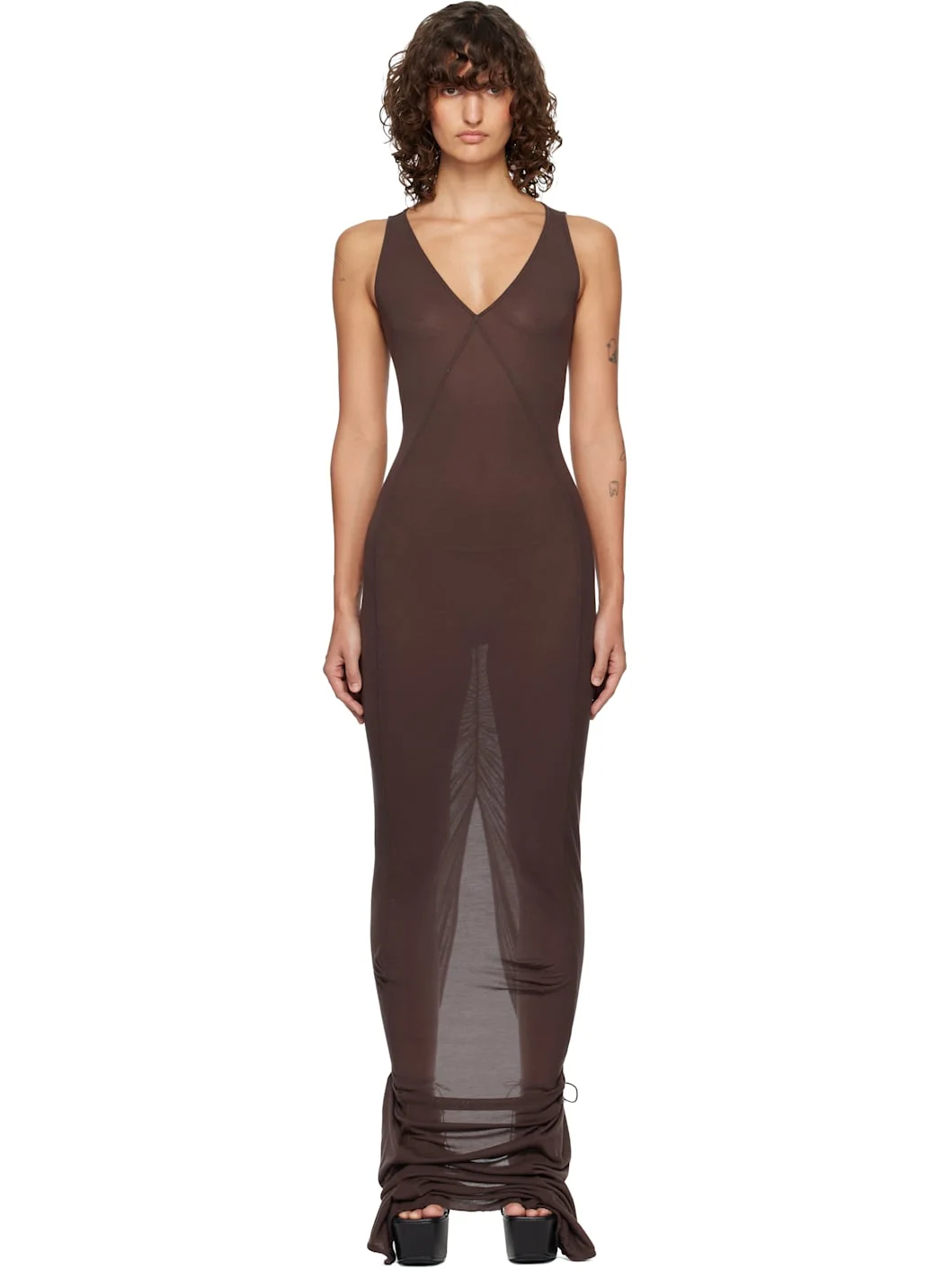 Semi-sheer viscose- and silk-blend jersey maxi dress. · Plunging V-neck · Ruching at back · Central vent at back hem Supplier color: Clay 88% viscose, 12% silk. Made in Italy 261232F055037