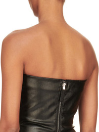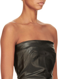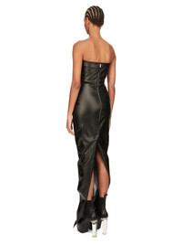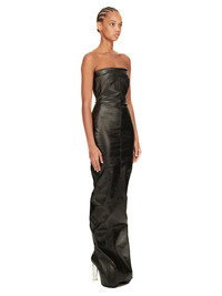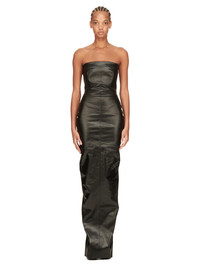 RICK OWENS FW24 PORTERVILLE BUSTIER GOWN IN BLACK COATED STRETCH DENIM THIS BUSTIER GOWN IS FLOOR LENGTH, WITH A CLOSE TO THE BODY FIT. IT HAS A STRAPLESS BUSTIER TOP, WITH A SIGNATURE GEO SEAM RUNNING ACROSS THE FRONT CHEST AND SLANTING DIAGONALLY DOWN THE SIDE BODY. IT HAS A CENTRE BACK ZIPPER AND A TAPERED SKIRT WITH A SPLIT IN THE CENTRE BACK SEAM UP TO THE KNEE, AND A RAW CUT HEM THIS LIGHTWEIGHT STRETCH DENIM IS COVERED WITH A SEMI-SHINY AND SOFT COATING. THE INDIGO COLOR AND STRUCTURE OF THE DENIM SHINES THROUGH THE COLOR OF THE COATING CREATING A MULTILAYERED AND IRREGULAR COLORATION. THE NATURAL ASPECTS OF THIS FABRIC MEANS THE COATING HAS PEELED OFF IN CERTAIN AREAS, EXPOSING THE UNDERLAYING MATERIAL AND WILL CONTINUE TO DO SO WITH WEAR AND ABRASION. THIS IS AN INHERENT CHARACTERISTIC OF THIS TYPE OF TREATMENT AND IS A DESIRED A VISUAL ASPECT WHICH ADDS TO THE UNIQUENESS OF EACH PIECE AND SHOULD NOT BE CONSIDERED A DEFECT - COLOR: BLACK - MATERIAL: 91% COTTON + 6% ELASTOMULTIESTER + 3% RUBBER - INNER BUSTIER 84% NYLON + 16% ELASTANE - MODEL IS 181CM TALL - MODEL WEARS SIZE 40