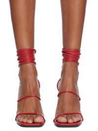 RICK OWENS SS26 TEMPLE CANTILEVER 8 WRAP SANDAL IN RED PEACHED LAMBSKIN THIS CANTILEVER 8 WRAP SANDAL IS OPEN TOE WITH LEATHER THONGING OVER THE TOES AND TOP FOOT. IT THEN PASSES AROUND THE BACK HEEL AND WRAPS THE ANKLE, TYING IN A KNOT. IT HAS AN 8CM CANTILEVERED HEEL. THIS LIGHTWEIGHT LAMB LEATHER HAS A SOFT AND NATURAL HANDFEEL ACHIEVED BY TUMBLING THE SKINS MULTIPLE TIMES IN A LARGE DRUM. COLOR: RED MATERIAL:UPPER 100% LAMB LEATHER INSOLE 100% CALF LEATHER SOLE 100% COW LEATHER SOLE DETAIL 100% THERMOPLASTIC POLYURETHANE SAMPLE SIZE 41 HEEL HEIGHT 8CM