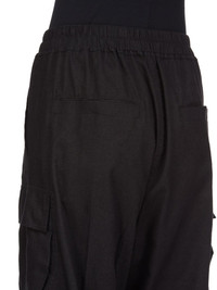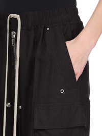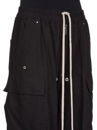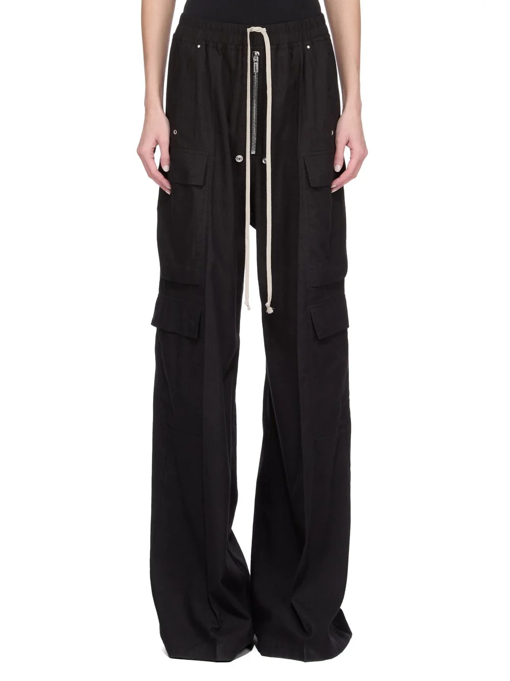RICK OWENS FW25 CONCORDIANS CARGOBELAS IN BLACK WOOL FLANNEL THESE CARGOBELAS PANTS ARE FULL-LENGTH WITH A LOW CROTCH AND WIDE LEG. THEY FEATURE AN ELASTICIZED WAISTBAND WITH DRAWSTRING AND A BELA EXPOSED CENTER ZIPPER WITH TWO SNAP DETAIL AT BOTTOM. THEY HAVE SIDE WELT POCKETS WITH RIVET AND EYELET DETAIL, FOUR BEVELED CARGO POCKETS ON THE SIDE LEG AND TWO REAR WELT POCKETS WITH CONCEALED SNAPS AND TOPSTITCHING THIS LIGHTWEIGHT WOOL AND COTTON BLEND FLANNEL HAS A SOFT AND BRUSHED HANDFEEL THIS FABRIC IS MADE USING GOTS CERTIFIED ORGANIC COTTON AND RWS CERTIFIED WOOL COLOR: BLACK MATERIAL: 81% COTTON + 19% WOOL MODEL IS 181CM TALL MODEL WEARS SIZE 40