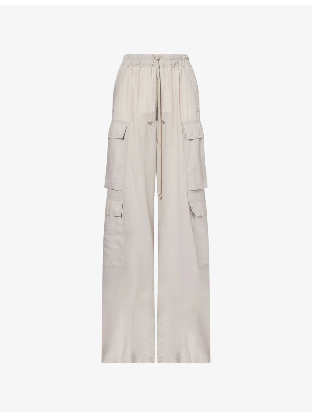PRODUCT DETAILS - Rick Owens wool trousers - 100% virgin wool - Regular fit, high rise, bootcut wide leg, drawstring elasticated waistband, slip pockets at front, cargo pockets, polished hardware - Dry clean - Made in Italy - True to size - Size UK 8: rise 15in / 38cm, inside leg 33.5in / 85cm, leg opening 15.5in / 39cm - Model is 5ft 10in/1.78m and wears a size UK 8 - Lightweight, non-stretch Ref: R04583830