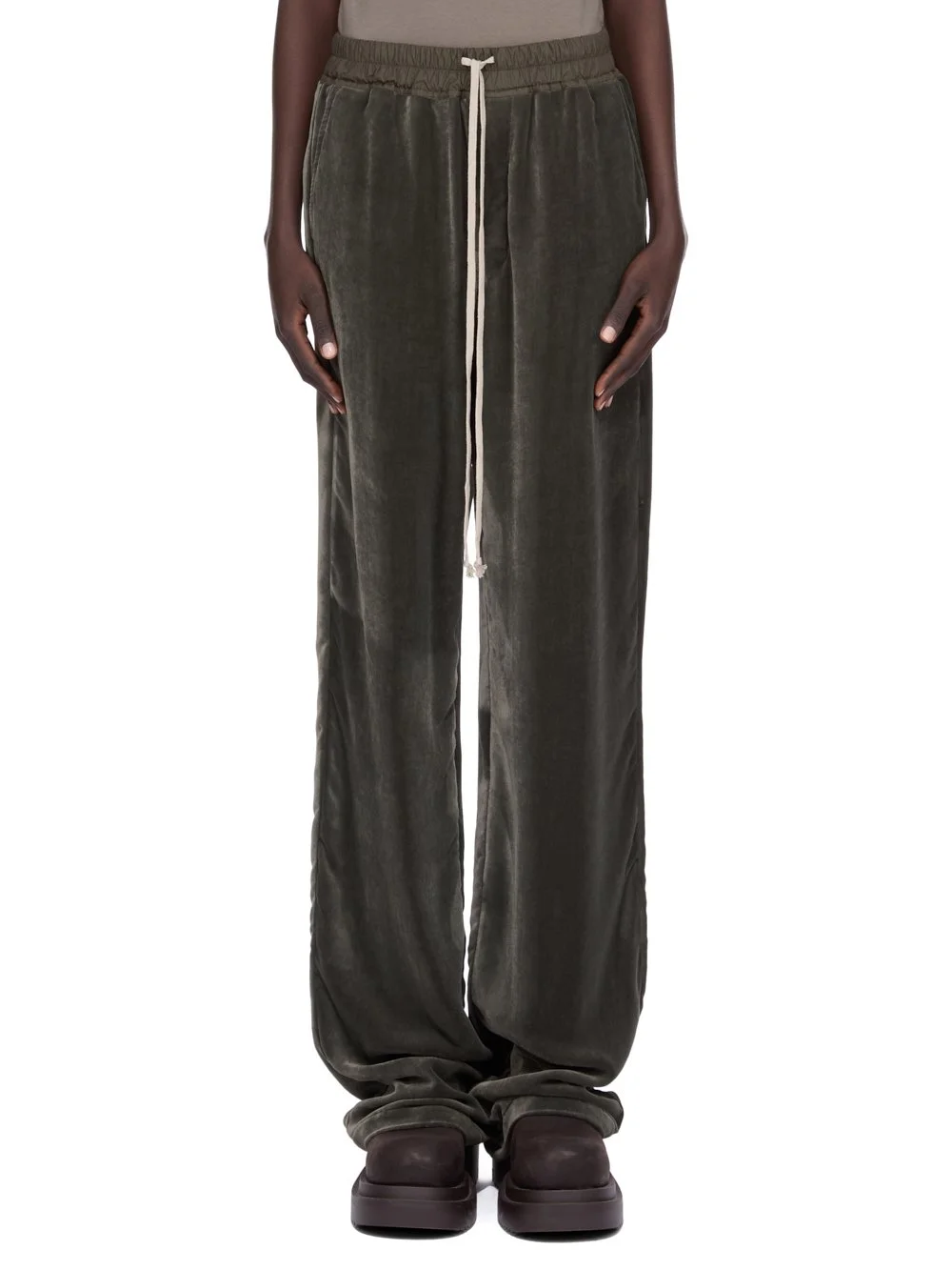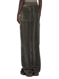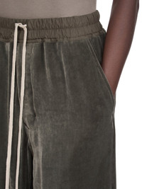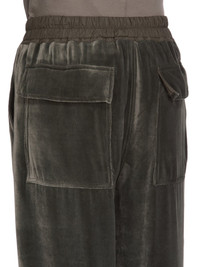 RICK OWENS FW25 CONCORDIANS DIETRICH DRAWSTRING IN BOSCO VELVET THESE DIETRICH DRAWSTRINGS ARE FULL-LENGTH WITH A LOOSE STRAIGHT LEG. THEY HAVE AN ELASTICIZED WAISTBAND WITH DRAWSTRING, AND A STITCHED FLY. THEY HAVE SIDE SEAM POCKETS AND TWO REAR SQUARE PATCH POCKETS WITH FLAPS THIS LIGHTWEIGHT AND FLUID VELVET HAS A SOFT AND WASHED UNEVEN FINISH. THIS FABRIC IS MADE FROM CERTIFIED VISCOSE WHICH ENSURES THAT THE FIBERS ARE PRODUCED FROM RESPONSIBLY MANAGED SOURCES AND NO DEFORESTATION OCCURS COLOR: BOSCO MATERIAL: 82% VISCOSE + 18% SILK BAND 65% COTTON + 35% NYLON MODEL IS 181CM TALL MODEL WEARS SIZE 40