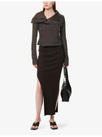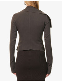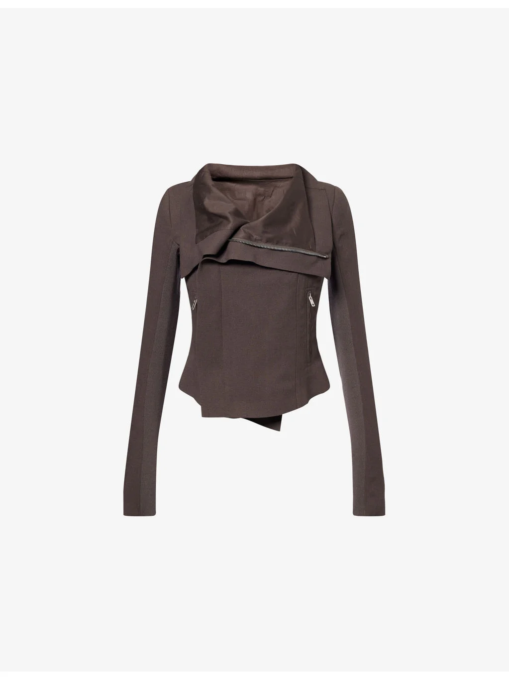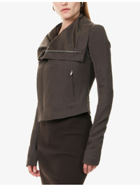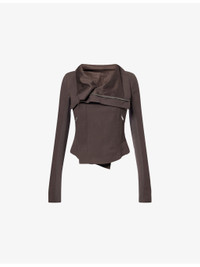 PRODUCT DETAILS - Rick Owens wool jacket - 100% virgin wool; buttons 100% buffalo horn; lining 100% cotton; sleevelining 100% cupro - Concealed zip fastening at front - Slim fit. high-neck, padded shoulders, ribbed panel at long sleeves, three zip pockets at front, fully lined - Dry clean - Made in Italy - True to size - Size UK 8: length 19in / 49cm - Model is 5ft 10in/1.78m and wears a size UK 8 - Midweight, slight stretch Ref: R04495624