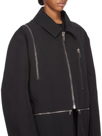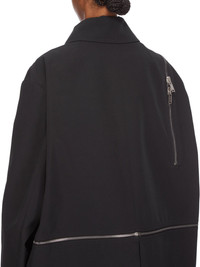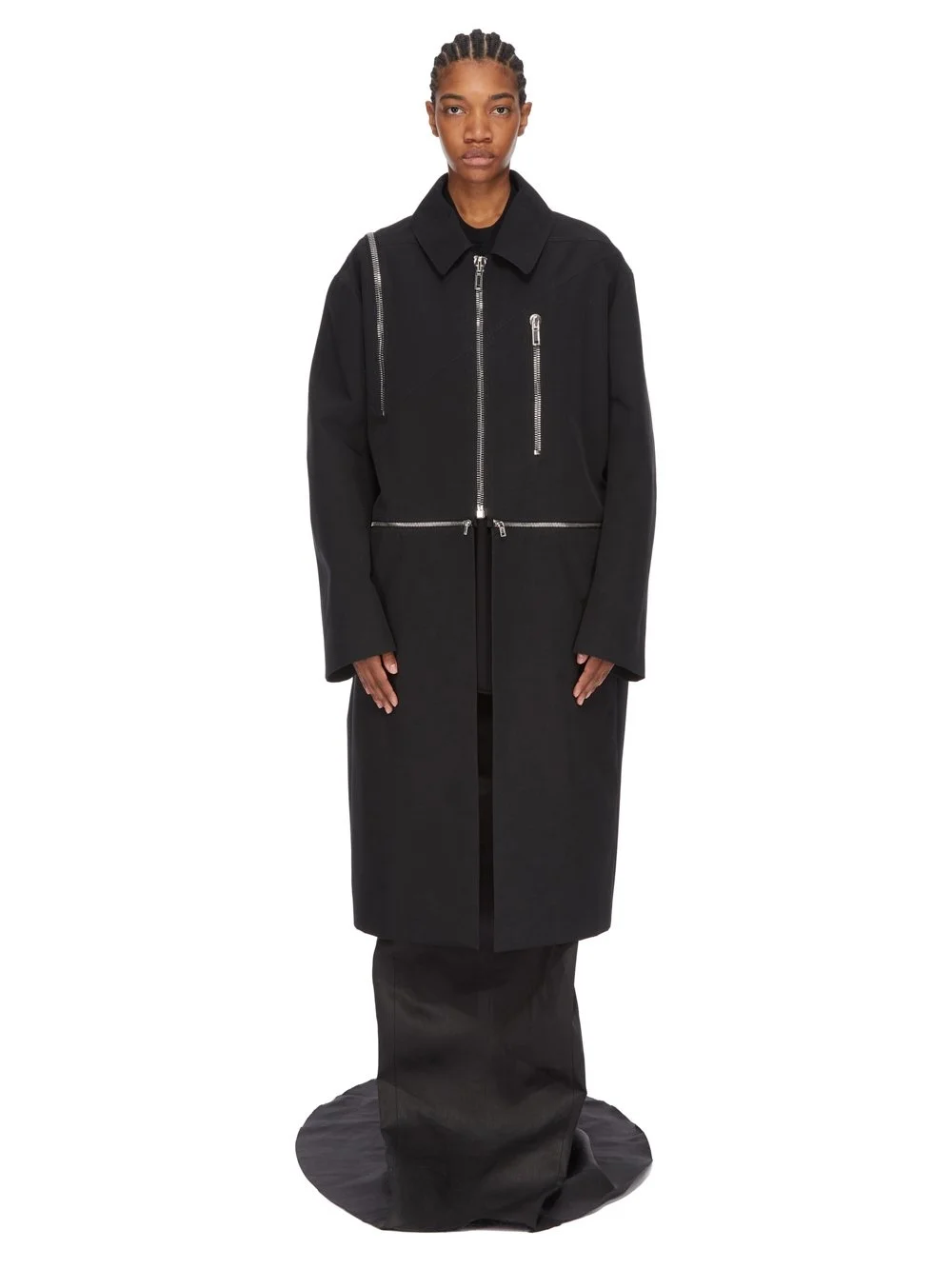 RICK OWENS SS25 HOLLYWOOD RUNWAY HEADON JUMBO MAC IN BLACK POLY COTTON CANVAS THIS JUMBO MAC IS KNEE-LENGTH WITH LONG SLEEVES AND A SQUARE FIT. IT HAS A CENTRE FRONT OPENING WITH CONCEALED BUTTON CLOSURES, ONE VISIBLE BUTTON AT THE NECK, AND A CLASSIC COLLAR. IT HAS SIDE FRONT POCKETS WITH BEVELED FLAPS, AND ONE FOG POCKET WITH VERTICAL OPENING, AND CONCEALED SNAP ON THE LEFT BREAST. IT FEATURES SIGNATURE LEVEL SHOULDER SEAMS AND A CENTRE BACK VENT. IT IS FULLY LINED WITH TWO INTERNAL ZIPPERED POCKETS THIS MEDIUMWEIGHT COTTON AND POLYESTER CANVAS HAS A VISIBLE CANVAS STRUCTURE AND A DRY HANDFEEL. THE FABRIC HAS MINIMAL FINISHING IN ORDER TO KEEP THE NATURAL CHARACTERISTICS OF THE COTTON YARN THIS FABRIC IS MADE USING GRS CERTIFIED RECYCLED POLYESTER WHICH ENSURES A REDUCTION IN WATER CONSUMPTION, EMISSIONS AND HAZARDOUS WASTE, LESSENING THE DEPENDENCE ON NON-RENEWABLE RESOURCES THIS FABRIC WAS WOVEN ON A 1950’S VINTAGE SHUTTLE LOOM BY BONOTTO, A 4TH GENERATION TEXTILE MILL FOUNDED IN 1912 SITUATED JUST BELOW THE PREALPS IN VENETO, ITALY COLOR: BLACK MATERIAL: 70% POLYESTER 30% COTTON MODEL IS 181CM TALL MODEL WEARS SIZE 48