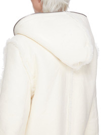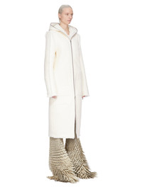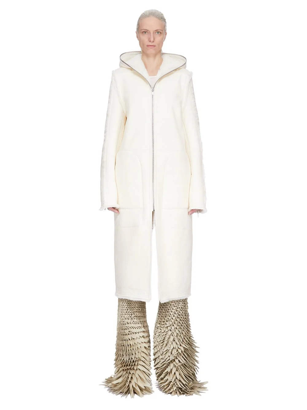 RICK OWENS FW25 CONCORDIANS GIMP KLAUS COAT IN MILK ALBINO SHEARLING THIS GIMP KLAUS COAT IS MID CALF LENGTH WITH A LOOSE STRAIGHT FIT AND LONG SLEEVES. IT HAS A CENTRE FRONT ZIP OPENING RUNNING FROM THROAT TO HIP LEVEL, A CLASSIC COLLAR, DIAGONAL SIDE FRONT WELT POCKETS WITH AN INTERNAL SNAP, SNAP CUFFS AND DOUBLE TOPSTITCHING. IT FEATURES THE SIGNATURE LEVEL SHOULDER SEAMS AND A COTTON WEBBING STRAP WITH RIVET DETAIL ON THE BACK YOKEIT IS FULLY LINED WITH INTERNAL ZIPPERED POCKETS THIS HEAVYWEIGHT SHEARLING LAMB LEATHER HAS A SEMI SHINY, WAXY NAPPA FINISH AND A SOFT NATURAL LENGTH FUR TANNED IN THE TUSCANY AREA OF ITALY USING A METAL FREE TANNING PROCESS, THESE SHEARLING MERINO HIDES ARE OF SPANISH ORIGIN, THE UNIQUE THICK FUR OF THESE ANIMALS MAKE THEM PERFECT FOR SHEARLING. BECAUSE THE HAIR IS NATURAL, THERE WILL BE VARIATIONS IN HAIR LENGTH AND TEXTURE, MAKING EACH PIECE UNIQUE THIS TANNERY IS LWG CERTIFIED WITH A SILVER RATING COLOR: MILK MATERIAL: 100% LAMB SHEARLING REAL FUR ZIPPER EDGE 100% CALF LEATHER POCKETS LINING 100% COTTON MODEL IS 181CM TALL MODEL WEARS SIZE 40