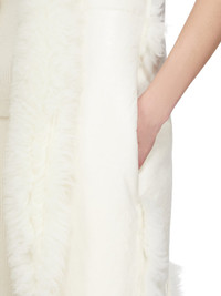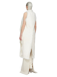 RICK OWENS FW25 CONCORDIANS RUNWAY SL CYCLOPS COAT IN MILK ALBINO SHEARLING THIS SL CYCLOPS COAT IS BELOW KNEE LENGTH AND SLEEVELESS. IT HAS A DEEP ARMHOLES AND AN OPEN FRONT AND SIDE SEAM POCKETS THIS HEAVYWEIGHT SHEARLING LAMB LEATHER HAS A SEMI SHINY, WAXY NAPPA FINISH AND A SOFT NATURAL LENGTH FUR TANNED IN THE TUSCANY AREA OF ITALY USING A METAL FREE TANNING PROCESS, THESE SHEARLING MERINO HIDES ARE OF SPANISH ORIGIN, THE UNIQUE THICK FUR OF THESE ANIMALS MAKE THEM PERFECT FOR SHEARLING. BECAUSE THE HAIR IS NATURAL, THERE WILL BE VARIATIONS IN HAIR LENGTH AND TEXTURE, MAKING EACH PIECE UNIQUE THIS TANNERY IS LWG CERTIFIED WITH A SILVER RATING COLOR: MILK MATERIAL: 100% LAMB SHEARLING REAL FUR MODEL IS 181CM TALL MODEL WEARS SIZE 40