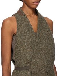 RICK OWENS FW25 CONCORDIANS RUNWAY SL CYCLOPS COAT IN BOSCO RUGGED WOOL THIS SL CYCLOPS COAT IS BELOW KNEE LENGTH AND SLEEVELESS. IT HAS A DEEP ARMHOLES AND A WRAP FRONT THAT SECURES WITH A WRAP-AROUND BELT, IN FRONT OR BACK THAT CREATES BACK DRAPING. IT HAS A BACK VENT AND INTERNAL BUTTONED POCKETS THIS HEAVYWEIGHT AND RUGGED WOOL MELTON IS COMPACT WITH A DRY HANDFEEL IT IS MADE FROM BRITISH WOOL BLENDED WITH KEMP, ALSO KNOWN AS DEAD HAIR. KEMP FIBERS ARE NATURAL TO SOME SHEEP BREEDS AND DO NOT TAKE DYE COLOR: BOSCO MATERIAL: 100% WOOL BODY AND POCKETS LINING 100% COTTON BUTTONS 100% BUFFALO HORN MODEL IS 181CM TALL MODEL WEARS SIZE 40