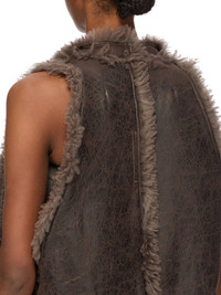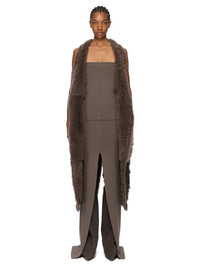 RICK OWENS FW25 CONCORDIANS RUNWAY SL CYCLOPS COAT IN DRKDUST CURLY SHEARLING THIS SL CYCLOPS COAT IS BELOW KNEE LENGTH AND SLEEVELESS. IT HAS A DEEP ARMHOLES AND AN OPEN FRONT AND SIDE SEAM POCKETS. THIS VERSION IS REVERSIBLE THIS HEAVYWEIGHT SHEARLING LAMB LEATHER HAS A WAXY NAPPA FINISH AND A SOFT NATURAL FUR TANNED IN THE TUSCANY AREA OF ITALY, THESE SHEARLING MERINO HIDES ARE OF SPANISH ORIGIN, THE UNIQUE THICK FUR OF THESE ANIMALS MAKE THEM PERFECT FOR SHEARLING. BECAUSE THE HAIR IS NATURAL, THERE WILL BE VARIATIONS IN HAIR LENGTH AND TEXTURE, MAKING EACH PIECE UNIQUE THIS TANNERY IS LWG CERTIFIED WITH A SILVER RATING COLOR: DRKDUST MATERIAL: 100% LAMB SHEARLING REAL FUR MODEL IS 181CM TALL MODEL WEARS SIZE 40