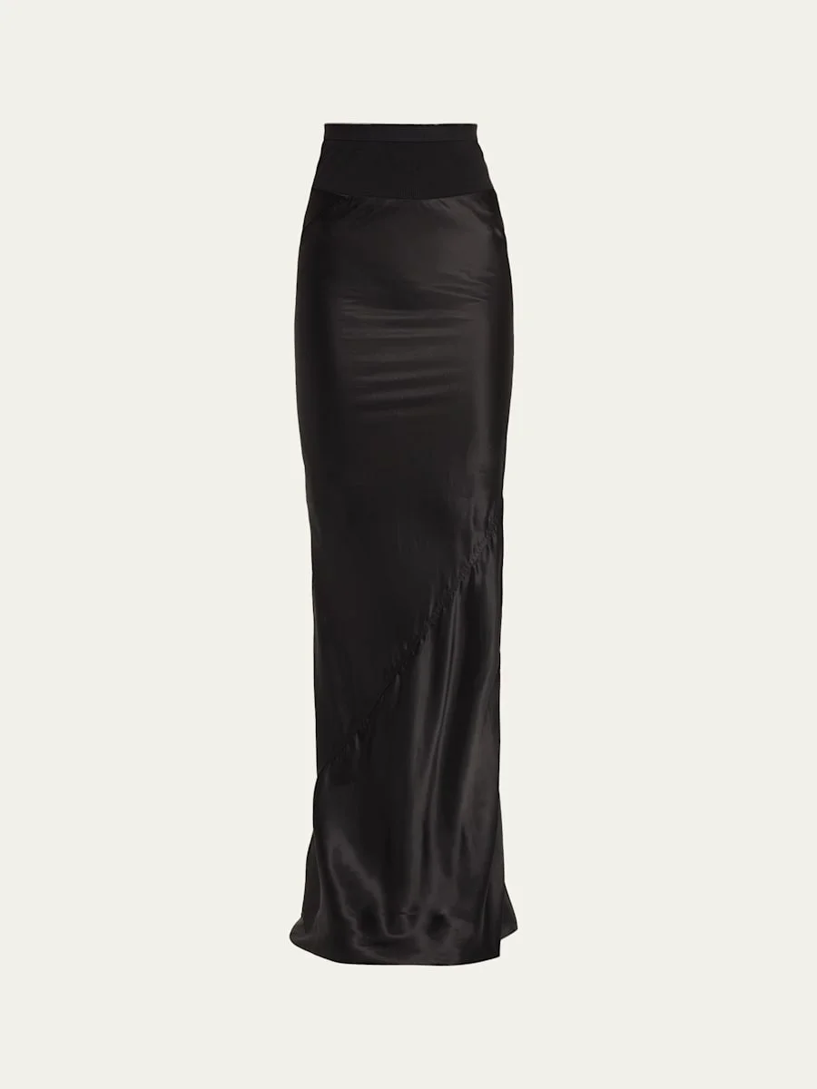 A study in dark, romantic motion, Rick Owens "Coda" mixedmedia skirt is defined by its masterful biascut construction. This technique allows the fabric to cling and stretch naturally over the form, leading to a dramatic, ruched mermaid back train. High waist Mermaid silhouette Floor sweeping hem Pullon style Cupro/cotton/nylon/polyamide Hand wash Made in Italy SIZE amp; FITModel measurements: 5'10" tall Model is wearing a US size 4/Small