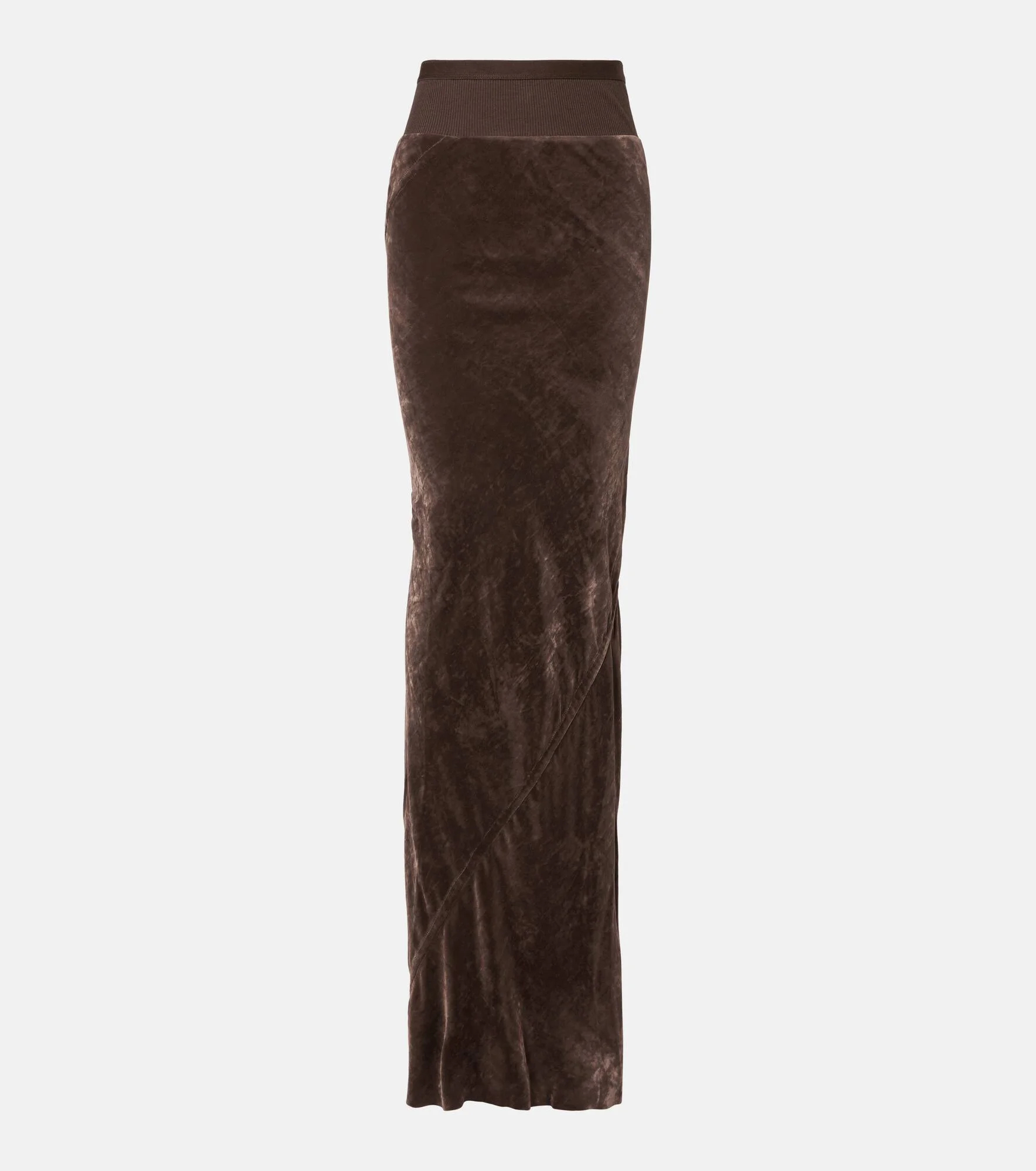 Aptly nicknamed The Lord of Darkness, Rick Owens brings gothic and industrial inspiration to avant-garde design. Made from velvet, the Coda maxi skirt comes in a column silhouette and is complete with an elasticated waistband. Product Details - Material: 82% viscose, 18% silk - Care instructions: dry clean - Made in Italy - Designer color name: Drkdust - Item color: brown - Trim: 65% cotton, 35% polyamide - Elasticated waistband - Item number: P01068293 Size & Fit - True to size - Elasticated waist - Non-stretchy fabric - The model seen in the picture is 178cm-5'10" and wearing a size IT 40
