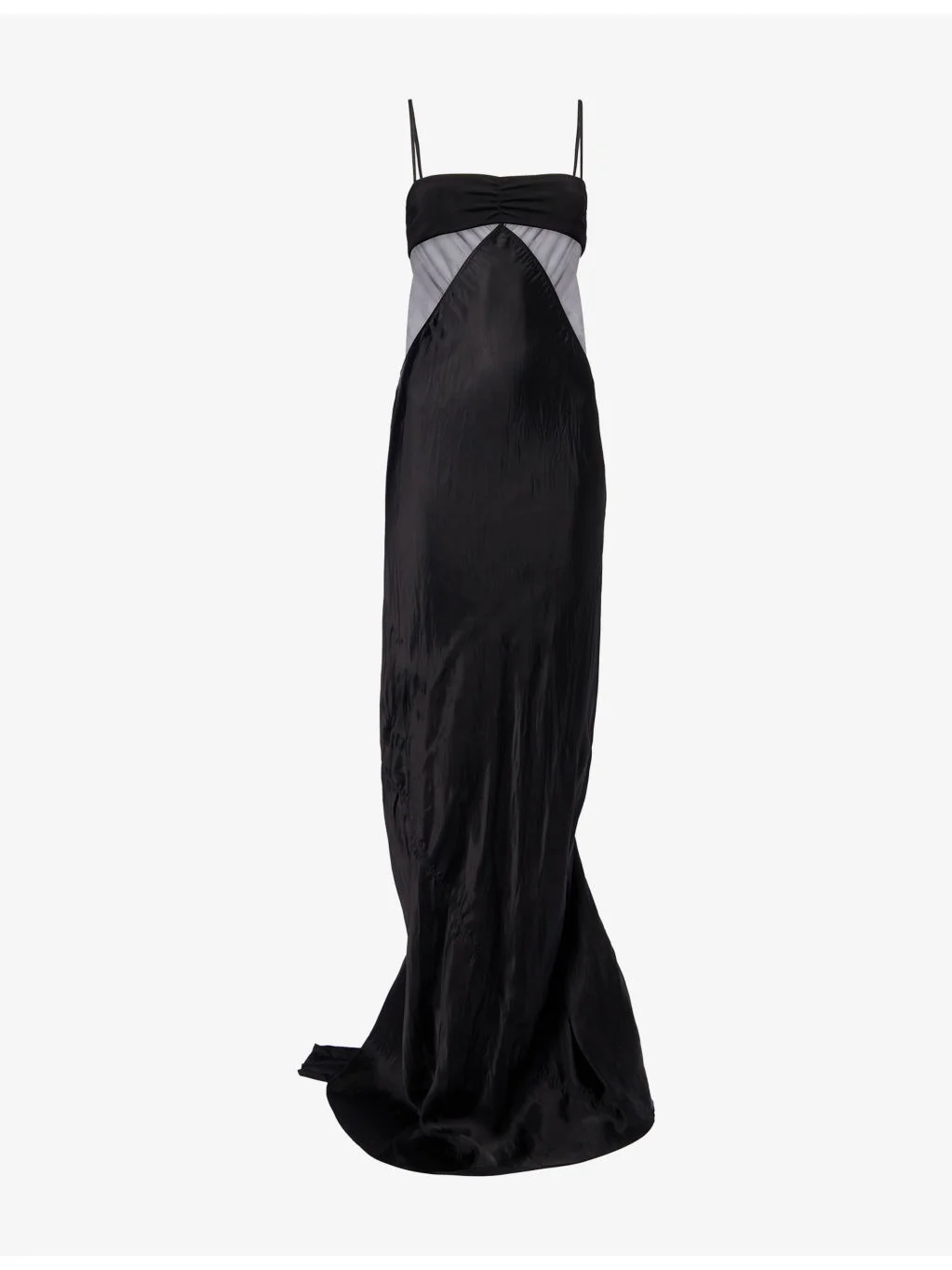 PRODUCT DETAILS - Rick Owens satin gown - 100% cupro; contrast 100% silk; trims 96% viscose, 4% elastane - Slim fit, straight neckline with ruching at centre, sleeveless, sheer panels at bodice, adjustable straps, panelled construction, flared hem - Dry clean only - Made in Italy - True to size - Size UK 8: length 62in / 157cm - Model is 5ft 10in/1.78m and wears a size UK 8 - Lightweight, non-stretch Ref: R04583841