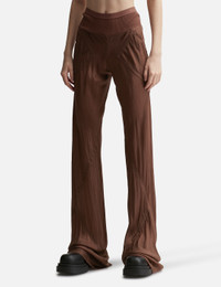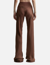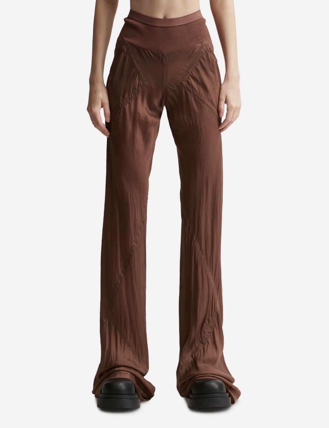 - Rick Owens - Bias Pants - Flared legs - Ribbed elastic waistband - Asymmetrical slip pockets - Color: Henna - Material: 61% Viscose, 39% Silk - See more Pants and Clothing SIZING - Model wears size 38 - Model measures: Height 179cm, Chest 32”/81cm, Waist 23’’/58.42cm, Hip 35’’/88.9cm