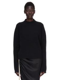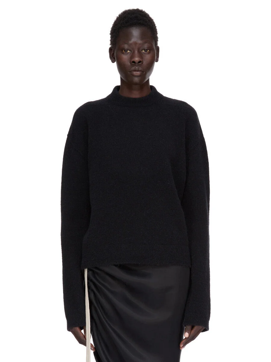 RICK OWENS FW25 CONCORDIANS TOMMY LS T IN BLACK ALPACA KNIT THIS TOMMY LS T IS BELOW HIP LENGTH WITH A JUMBO OVERSIZED FIT. IT HAS WIDE LONG SLEEVES WITH A DROPPED ARMHOLE, A RIBBED CREWNECK AND HEM. IT FEATURES A SIGNATURE FRONT LEVEL SHOULDER LINE AND KNIT CHANNEL RUNNING DOWN THE CENTRE BACK SPINE. THIS A DENSE BUT LIGHT KNIT WITH A SOFT SLIGHTLY FLUFFY HAND. COLOR: BLACK MATERIAL: 48% ALPACA + 30% NYLON + 20% WOOL + 2% ELASTANE MODEL IS 181CM TALL MODEL WEARS SIZE S