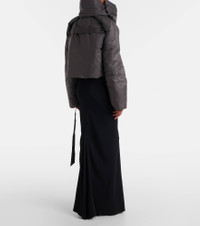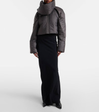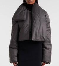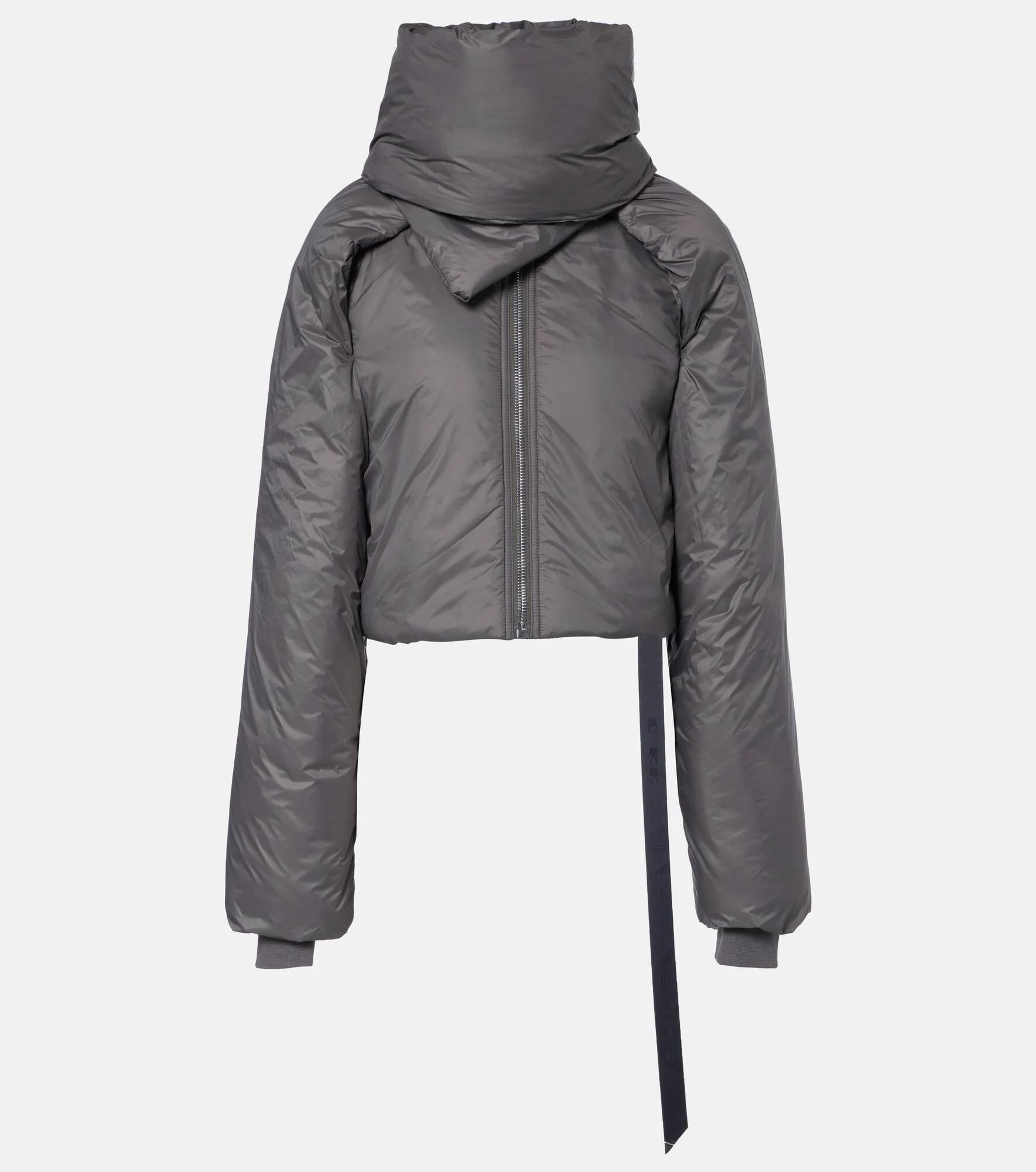 This puffer jacket from Rick Owens is defined by a durable technical fabric construction. The design comes in a slightly cropped silhouette, fitted with a detachable padded scarf for added warmth and comfort. Product Details - Material: 100% polyamide - Care instructions: dry clean - Made in Moldova - Designer color name: Bronze - Item color: gray - Trim: 98% cotton, 2% elastane - Filling: 100% polyester - Closure: zipper, snap-button fastenings - Cuff: ribbed - Detachable band - Item number: P01069208 Size & Fit - Fits large to size - we recommend trying one size smaller - Straight fit - Non-stretchy fabric - Slightly cropped - The model seen in the picture is 178cm-5'10" and wearing a size XS