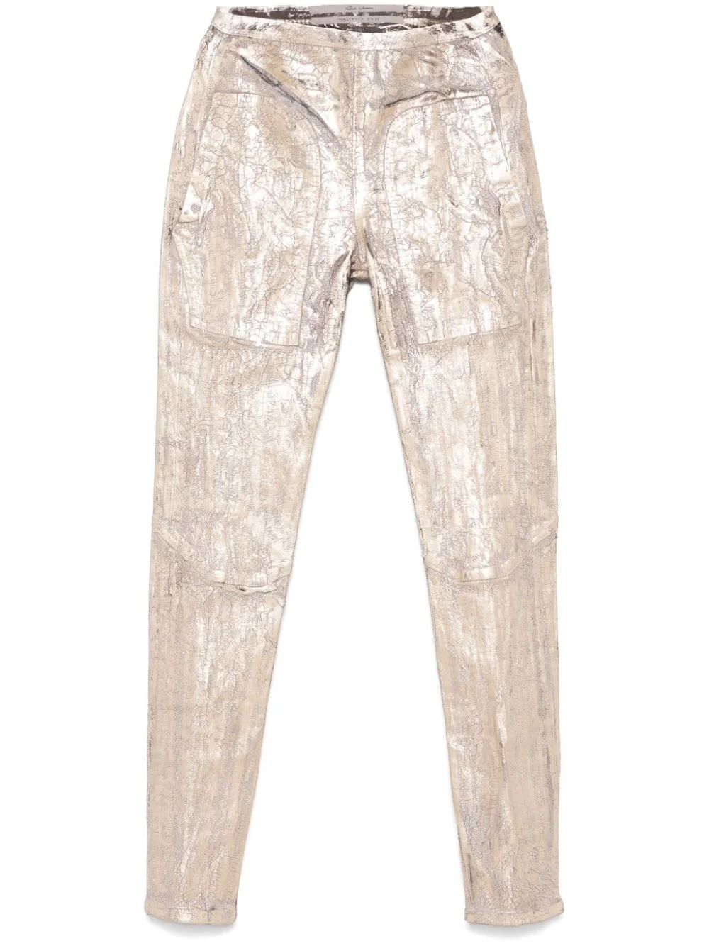 cracked-effect trousers Highlights - Gold-tone - Elasticated waistband - Two side patch pockets Made in Italy Composition Cotton 91%, Elastomultiester 6%, Rubber 3% SIZE & FIT Model measurements Height 5 ft 9 in(1.76 m) Bust/Chest 32.28 in(82 cm) Hips 35.43 in(90 cm) Waist 25.19 in(64 cm)