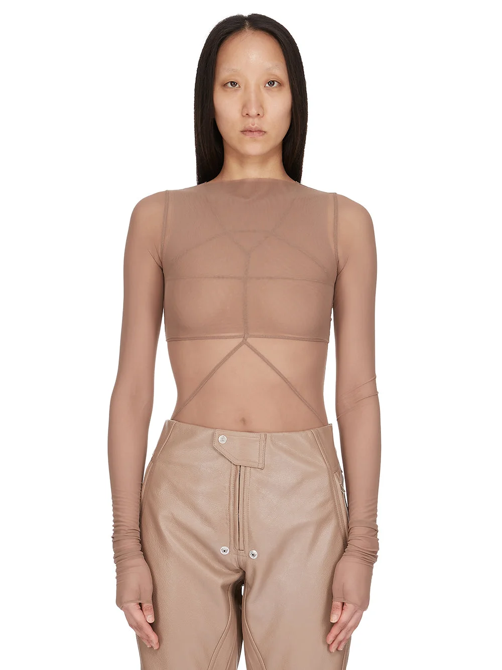 RICK OWENS SS26 TEMPLE CROP TOP IN DNA STRETCH TULLE THIS CROP TOP IS JUST UNDER BUST HEIGHT WITH LONG SLEEVES. IT HAS A CLOSE TO THE BODY FIT AND A HIGH CUT NECKLINE. THIS VERSION IS TRANSPARENT AND CAN BE WORN LAYERED WITH OTHER GARMENTS IN THE TULLE SECTION OF THIS COLLECTION. THIS LIGHTWEIGHT AND SHEER NYLON STRETCH TULLE HAS A SOFT HANDFEEL. THIS FABRIC IS MADE USING GRS CERTIFIED RECYCLED POLYAMIDE WHICH ENSURES A REDUCTION IN WATER CONSUMPTION, EMISSIONS AND HAZARDOUS WASTE, LESSENING THE DEPENDENCE ON NON-RENEWABLE RESOURCES. COLOR: DNA MATERIAL:93% NYLON + 7% ELASTANE MODEL IS 181CM TALL MODEL WEARS SIZE 40