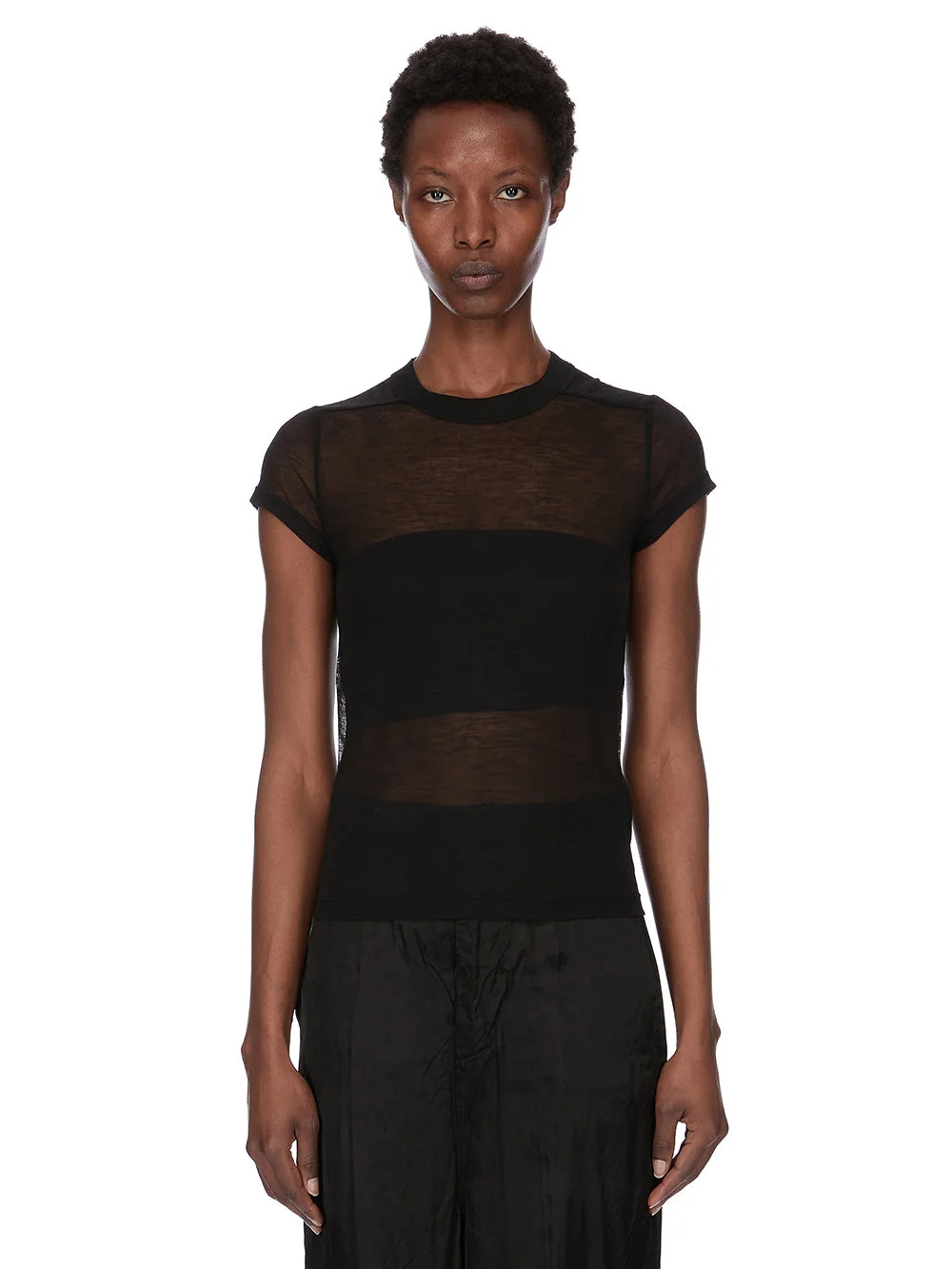 RICK OWENS SS26 TEMPLE CROPPED LEVEL T IN BLACK WOOL JERSEY THIS CROPPED LEVEL T IS ABOVE-HIP LENGTH WITH SHORT SLEEVES AND A SLIM FIT. IT HAS A RIBBED CREWNECK AND SIGNATURE LEVEL SHOULDER SEAMS AND SINGLE SEAM RUNNING DOWN THE CENTER BACK SPINE. THIS LIGHTWEIGHT AND SHEER WOOL BLEND JERSEY HAS A SOFT AND COOL HANDFEEL. THIS JERSEY IS MADE FROM RWS CERTIFIED VIRGIN WOOL AND GRS CERTIFIED RECYCLED POLYESTER. COLOR: BLACK MATERIAL:56% WOOL + 44% POLYESTER MODEL IS 181CM TALL MODEL WEARS SIZE 40