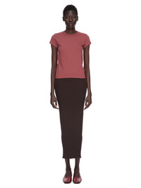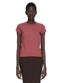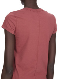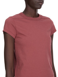 RICK OWENS FW25 CONCORDIANS CROPPED LEVEL T IN ROSEWOOD CLASSIC COTTON JERSEY THIS CROPPED LEVEL T IS ABOVE HIP LENGTH WITH SHORT SLEEVES AND A SLIM FIT. IT HAS A RIBBED CREWNECK AND SIGNATURE LEVEL SHOULDER SEAMS AND SINGLE SEAM RUNNING DOWN THE CENTRE BACK SPINE THIS MEDIUMWEIGHT CLASSIC COTTON JERSEY IS COMPACT WITH A DRY HANDFEEL THIS JERSEY IS MADE USING GOTS CERTIFIED ORGANIC COTTON WHICH MEANS THE NATURAL FIBER IS GROWN WITHOUT HARMFUL CHEMICALS, LEAVING OUR SOIL, AIR AND WATER CLEANER FROM CONTAMINATES WE STRIVE TO KEEP OUR PRODUCTION AS LOCAL AS POSSIBLE. THE FULL MANUFACTURING CYCLE OF THIS PRODUCT, FROM THE MATERIAL KNITTING TO SEWING AND FINISHING, WAS UNDERTAKEN CLOSE TO OUR HOME BASE IN CONCORDIA, ITALY COLOR: ROSEWOOD MATERIAL: 100% COTTON MODEL IS 181CM TALL MODEL WEARS SIZE 40