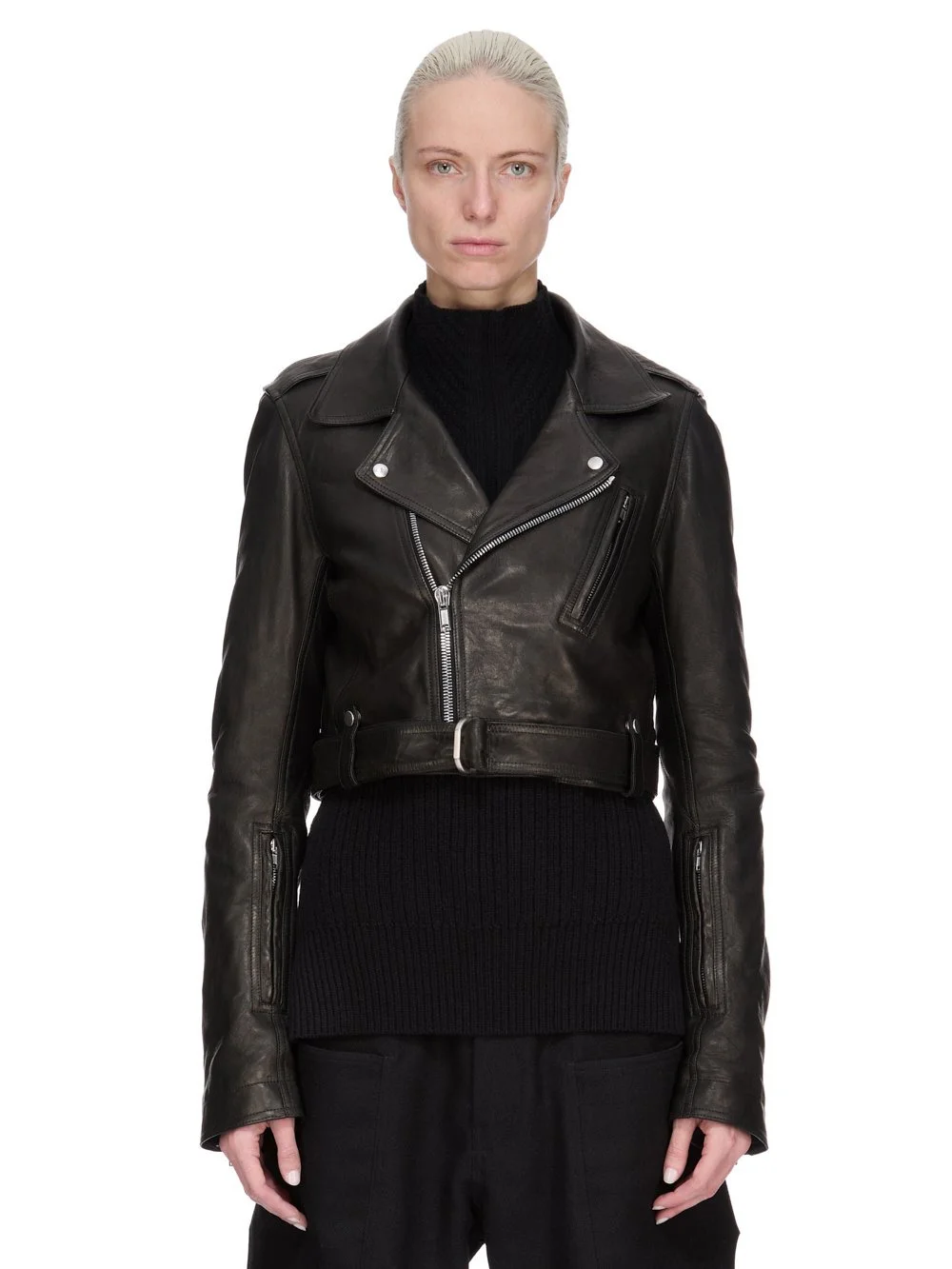 RICK OWENS FW25 CONCORDIANS CROPPED LUKE STOOGES IN BLACK VEG NAPPA LAMB THIS CROPPED LUKE STOOGES IS WAIST-LENGTH WITH LONG SLEEVES. IT FEATURES A BIKER DOUBLE BREASTED FRONT WITH OFF CENTRE ZIPPER A WIDE COLLAR AND LAPEL WITH SNAPS. IT FEATURES A ZIPPED POCKET ON THE LEFT FOREARM, A JET POCKET WITH ZIP ON THE LEFT CHEST. IT HAS ZIP OPENINGS AT WRISTS, SHOULDER EPAULETTES WITH SNAP DETAILS AND A DETACHABLE BELT RUNNING THROUGH LOOPS AT THE BACK WAISTBAND THAT CAN CLOSE WITH TWO D-RINGSIT IS FULLY LINED WITH TWO INNER ZIPPED POCKETS THIS MEDIUMWEIGHT LAMB LEATHER IS VEG TANNED AND FINISHED USING NATURAL WAXES AND ANILINE WHICH MAKES A SUPPLE HANDFEEL. BECAUSE THIS SKIN IS NAKED, NOT FINISHED USING ANY PIGMENTS COVERING THE SKIN, NATURAL MARKINGS AND SHADINGS ARE VISIBLE WHICH MAKES EACH SKIN AND PRODUCT UNIQUE VEG TANNING MEANS ONLY VEGETAL AND NATURAL TANNINS WERE USED IN THE PROCESS OF TANNING AND PRESERVING THIS LEATHER COLOR: BLACK MATERIAL: 100% LAMB LEATHER BODY AND POCKETS LINING 100% COTTON SLEEVES LINING 100% CUPRO MODEL IS 181CM TALL MODEL WEARS SIZE 40