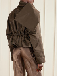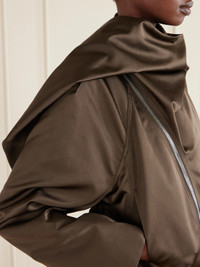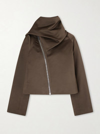 This jacket will be recognizable to those in the know as a Rick Owens creation. Cut from smooth satin-shell, it's gathered at the back to emphasize the cropped hem and has an asymmetric zipped front. Leave the scarf neckline effortlessly draped across your shoulder.