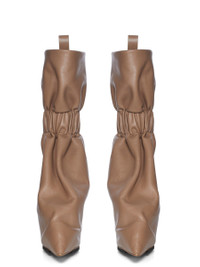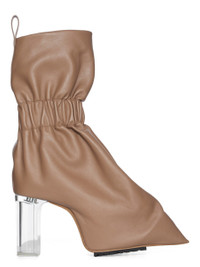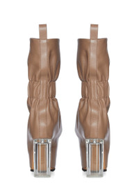 RICK OWENS SS26 TEMPLE CUFFED TAQUITO PULL ON IN DNA/CLEAR GRAINY COW LEATHER THESE CUFFED TAQUITO PULL ON ARE A SHORT, DEFLATED, VERSION OF OUR STRAYTUKAY COLLABORATION BOOTS. THEY ARE ANKLE HEIGHT. THEY FEATURE A LEATHER UPPER THAT FLARES DOWN FROM THE ANKLE AND IS ELASTICIZED AROUND THE ANKLE, CREATING A SLIGHT DRAPE. IT THEN CURVES INTO THE BACK HEEL AND POINTS AT THE TOE. THEY HAVE A 12CM HEEL, A THICK FRONT PLATFORM (7,5CM) AND A 4,5CM RISE AND A BACK PULL TAB. THIS MEDIUMWEIGHT COW LEATHER HAS A SUBTLE GRAIN TEXTURE AND NATURAL HANDFEEL. TANNED IN THE VENETO AREA OF ITALY, THIS LEATHER IS TUMBLED MULTIPLE TIMES IN A LARGE DRUM IN ORDER TO BRING OUT THE NATURAL GRAIN TEXTURE OF THE SKIN. THE LEATHER IS FINISHED WITH ANILINE AND AIR-DRIED IN ORDER TO ACHIEVE THE NATURAL AND WAXY HANDFEEL. THIS TANNERY IS LWG CERTIFIED WITH A SILVER RATING. COLOR: DNA/CLEAR MATERIAL: UPPER 100% CALF LEATHER LINING 100% CALF LEATHER INSOLE 100% CALF LEATHER SOLE 100% COW LEATHER SOLE DETAIL 100% RUBBER