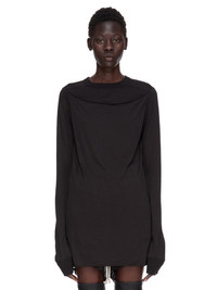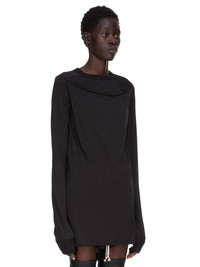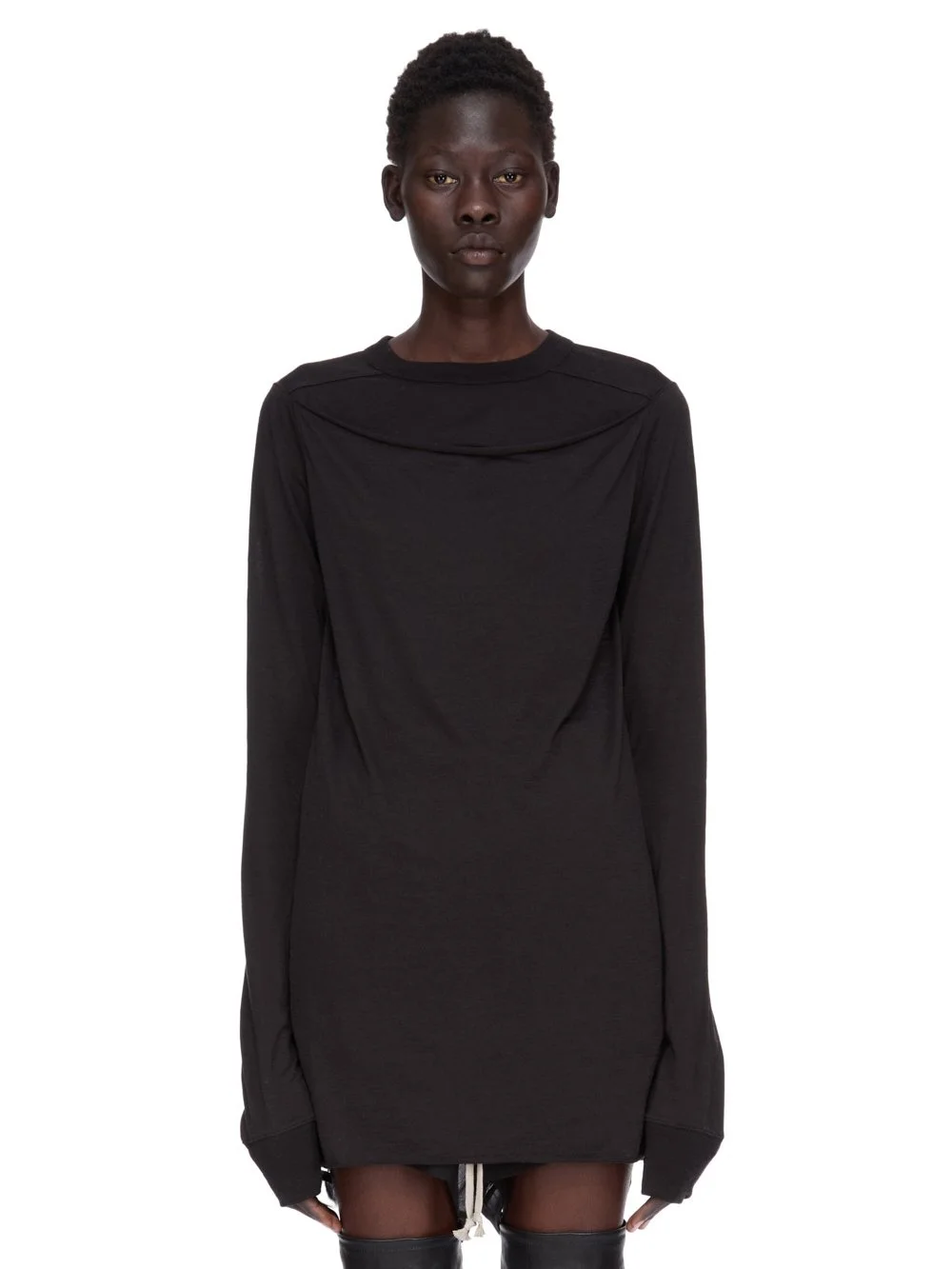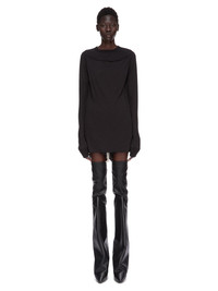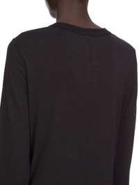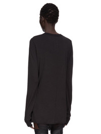 RICK OWENS FW25 CONCORDIANS RIB LS T IN BLACK SILK WOOL JERSEY THIS SLASHED LEVEL LS T IS BELOW HIP LENGTH WITH LONG SLEEVES. IT HAS A RIBBED ROUND NECK AND CUFFS. IT FEATURES A SLASHED FRONT THAT CREATES A SLIGHTLY GAPING OPENING, WITH ROLLED EDGE, ACROSS THE TOP OF THE CHEST. IT FEATURES THE SIGNATURE LEVEL SHOULDER SEAMS AND SINGLE SEAM RUNNING DOWN THE CENTRE BACK SPINE THIS LIGHTWEIGHT SILK AND WOOL BLEND JERSEY HAS A SOFT HANDFEEL AND SEMI SHINY SURFACE THIS JERSEY IS MADE FROM RWS CERTIFIED VIRGIN WOOL WHICH ENSURES A HIGH STANDARD IN ANIMAL WELFARE, ENVIRONMENTAL SUSTAINABILITY AND SOCIAL RESPONSIBILITY. EACH BALE OF WOOL IS TRACEABLE BACK TO ITS SOURCE WE STRIVE TO KEEP OUR PRODUCTION AS LOCAL AS POSSIBLE. THE FULL MANUFACTURING CYCLE OF THIS PRODUCT, FROM THE MATERIAL KNITTING TO SEWING AND FINISHING, WAS UNDERTAKEN CLOSE TO OUR HOME BASE IN CONCORDIA, ITALY COLOR: BLACK MATERIAL: 70% NEW WOOL + 30% SILK MODEL IS 181CM TALL MODEL WEARS SIZE 40