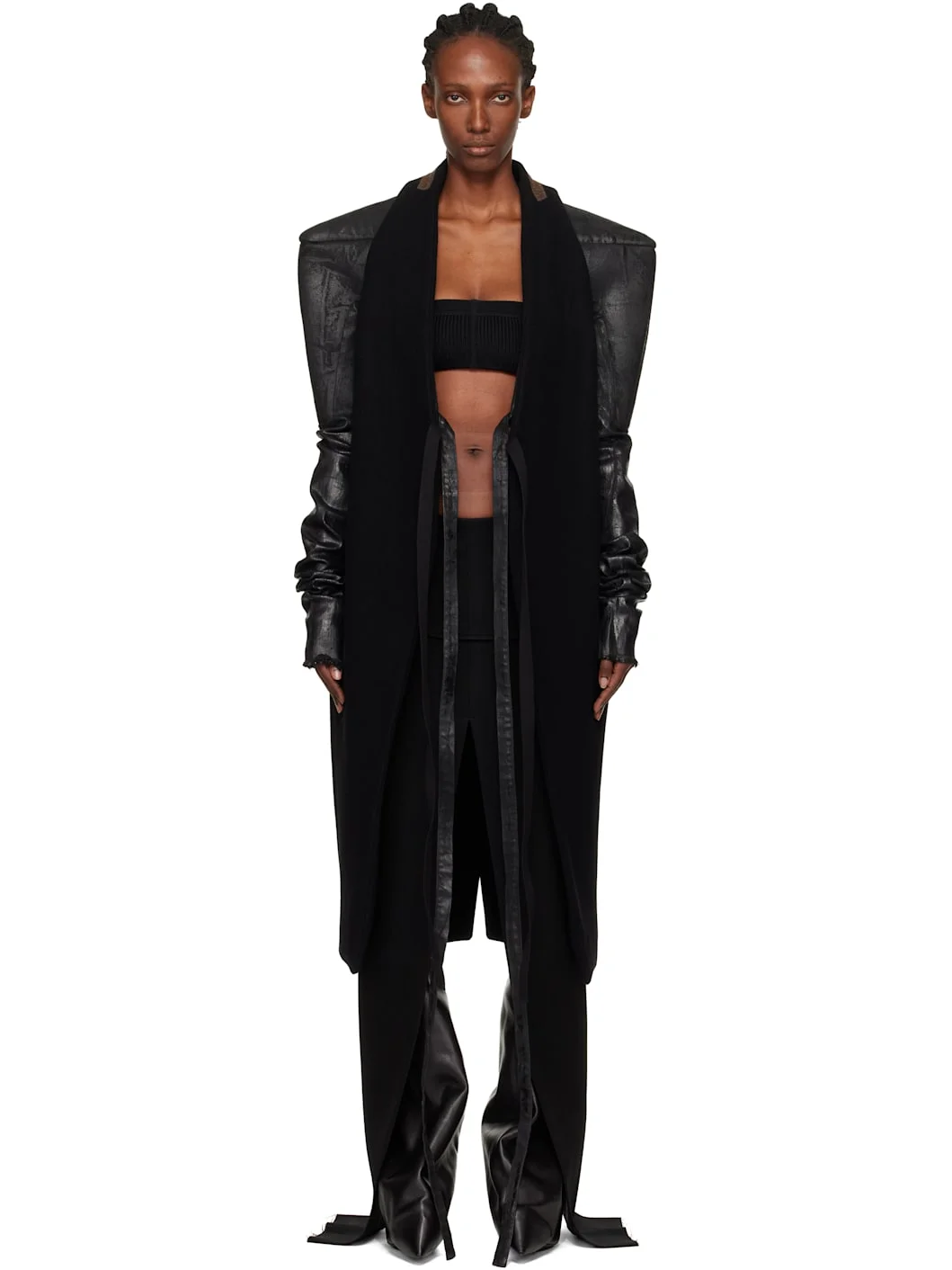 Virgin wool melton coat. · Wrap construction · V-neck · Felted trim at collar · Self-tie straps and seam pockets at waist · Central vent with button fastening at back hem · Full cotton twill lining · Buffalo horn hardware Supplier color: Black Body: 100% virgin wool. Lining: 100% cotton. Made in Italy 252232F059010