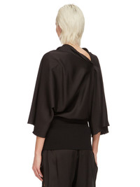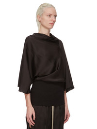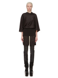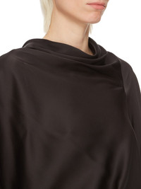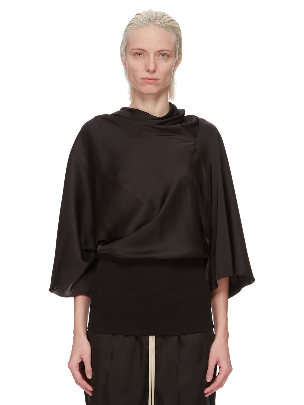 RICK OWENS FW24 PORTERVILLE CYLINDER TOP IN BLACK WASHED CHARMEUSE THIS CYLINDER TOP IS HIP-LENGTH, WITH A DRAPED BIAS CUT BODY, ELBOW-LENGTH WIDE SLEEVES AND A HIGH DRAPED COWL NECK THAT HAS AN ASYMMETRICAL OPENING AT BACK. IT GATHERS INTO THE WAIST AND FINISHES IN A TIGHT BODY OVER THE HIP THIS LIGHTWEIGHT AND FLUID CHARMEUSE IS HAS A SEMI-SHINY SURFACE AND WASHED FINISH. THIS FABRIC IS MADE FROM FSC® CERTIFIED VISCOSE WHICH ENSURES THAT THE FIBERS ARE PRODUCED FROM RESPONSIBLY MANAGED SOURCES AND NO DEFORESTATION OCCURS - COLOR: BLACK - MATERIAL: 61% ACETATE + 39% VISCOSE - BOTTOM 100% COTTON - MODEL IS 181CM TALL - MODEL WEARS SIZE 40
