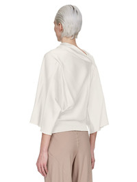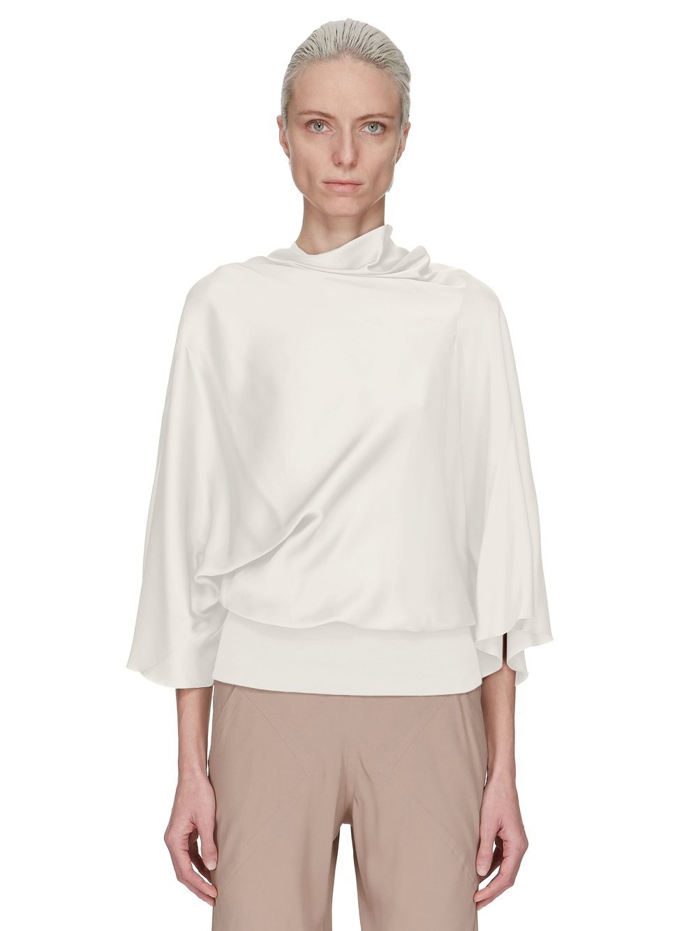 RICK OWENS SS25 HOLLYWOOD CYLINDER TOP IN DINGE WASHED CHARMEUSE THIS CYLINDER TOP IS HIP LENGTH. IT HAS A DRAPED, BIAS CUT BODY, ELBOW-LENGTH WIDE SLEEVES AND A HIGH DRAPED COWL NECK THAT HAS AN ASYMMETRICAL OPENING AT BACK. IT GATHERS INTO THE WAIST AND FINISHES IN A TIGHT BODY TO THE HIP THIS LIGHTWEIGHT AND FLUID CHARMEUSE IS HAS A SEMI-SHINY SURFACE AND WASHED FINISH. THIS FABRIC IS MADE FROM CERTIFIED VISCOSE WHICH ENSURES THAT THE FIBERS ARE PRODUCED FROM RESPONSIBLY MANAGED SOURCES AND NO DEFORESTATION OCCURS COLOR: DINGE MATERIAL: 61% ACETATE + 39% VISCOSE BOTTOM 100% COTTON MODEL IS 181CM TALL MODEL WEARS SIZE 40