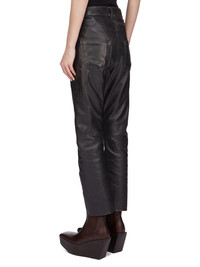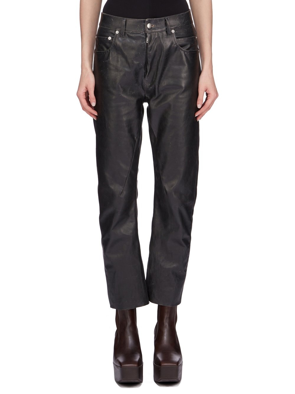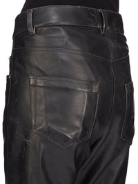 RICK OWENS SS25 HOLLYWOOD DETROIT CUT IN BLACK TAMPONATO CALF LEATHER THESE DETROIT CUT PANTS ARE A SLIM FIT AND LOW-RISE 5 POCKET JEAN. THEY HAVE A BUTTON FLY, A WAISTBAND WITH BELT LOOPS AND POCKET RIVETS, AND REAR PATCH POCKETS WITH TOPSTITCHING THIS MEDIUMWEIGHT CALF LEATHER HAS A SMOOTH AND MATTE SURFACE. IT IS FINISHED WITH A TECHNIQUE CALLED TAMPONATURA WHICH MEANS THE BLACK COLOR AND WAX IS APPLIED AFTER THE SKIN HAS BEEN TANNED AND DYED THE BLACK LAYER WILL THEN RUB OFF WITH WEAR AND ABRASION GIVING EACH GARMENTS ITS OWN UNIQUE LOOK. THIS LEATHER IS MADE BY A THIRD GENERATION FAMILY OWNED TANNERY IN THE SOUTH OF ITALY COLOR: BLACK MATERIAL: 100% CALF LEATHER MODEL IS 181CM TALL MODEL WEARS SIZE 40