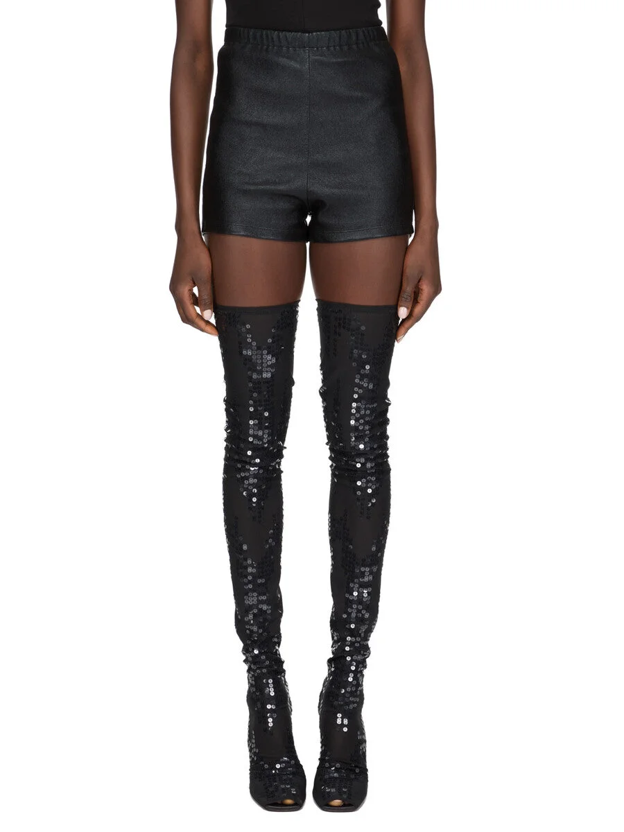RICK OWENS SS26 TEMPLE DIRT BOLAN CUT OFF IN BLACK LACQUER LAMB LEATHER THESE DIRT BOLAN CUT-OFFS ARE CUT HIGH ON THE THIGH AND ARE TIGHT FITTING WITH AN EXTRA HIGH WAIST. THIS STRETCH LAMB LEATHER HAS A SMALL GRAIN TEXTURE AND GLOSSY LACQUER FINISH. THIS LEATHER IS MADE BY A SECOND GENERATION FAMILY OWNED TANNERY IN THE SOUTH OF FRANCE SPECIALISING ONLY IN STRETCH LEATHER PRODUCTION. EACH SKIN IS STRETCHED OUT TO ITS LIMIT AND BONDED TO A COTTON AND LYCRA FABRIC BACKING. WHEN DYED, THE HEAT OF THE PROCESS ACTIVATES THE LYCRA ELASTIC FIBRES THAT SHRINK THE FABRIC AND WITH IT THE SKIN, BACK TO ITS ORIGINAL SIZE. THE LEATHER THEN EXITS THE PROCESS AS STRETCH. COLOR: BLACK MATERIAL:65% LAMB LEATHER + 34% COTTON + 1% SPANDEX MODEL IS 181CM TALL MODEL WEARS SIZE 40