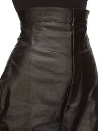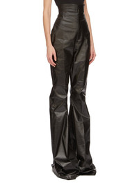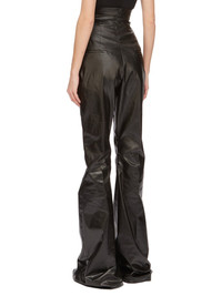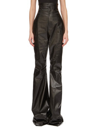 RICK OWENS FW24 PORTERVILLE DIRT BOLAN IN BLACK COATED STRETCH DENIM THIS DIRT BOLAN HAS AN EXTREME, HIGH WAIST, AND A FLOOR-LENGTH BOOT CUT. THEY HAVE A TAILORED WAISTBAND WITH WRAP CLOSURE AND CONCEALED FLY, SIDE SEAM POCKETS AND REAR JET POCKETS THIS LIGHTWEIGHT STRETCH DENIM IS COVERED WITH A SEMI-SHINY AND SOFT COATING. THE INDIGO COLOR AND STRUCTURE OF THE DENIM SHINES THROUGH THE COLOR OF THE COATING CREATING A MULTILAYERED AND IRREGULAR COLORATION. THE NATURAL ASPECTS OF THIS FABRIC MEANS THE COATING HAS PEELED OFF IN CERTAIN AREAS, EXPOSING THE UNDERLAYING MATERIAL AND WILL CONTINUE TO DO SO WITH WEAR AND ABRASION. THIS IS AN INHERENT CHARACTERISTIC OF THIS TYPE OF TREATMENT AND IS A DESIRED A VISUAL ASPECT WHICH ADDS TO THE UNIQUENESS OF EACH PIECE AND SHOULD NOT BE CONSIDERED A DEFECT - COLOR: BLACK - MATERIAL: 91% COTTON + 6% ELASTOMULTIESTER + 3% RUBBER - POCKETS LINING 100% COTTON - BUTTONS 100% BUFFALO HORN - MODEL IS 181CM TALL - MODEL WEARS SIZE 38