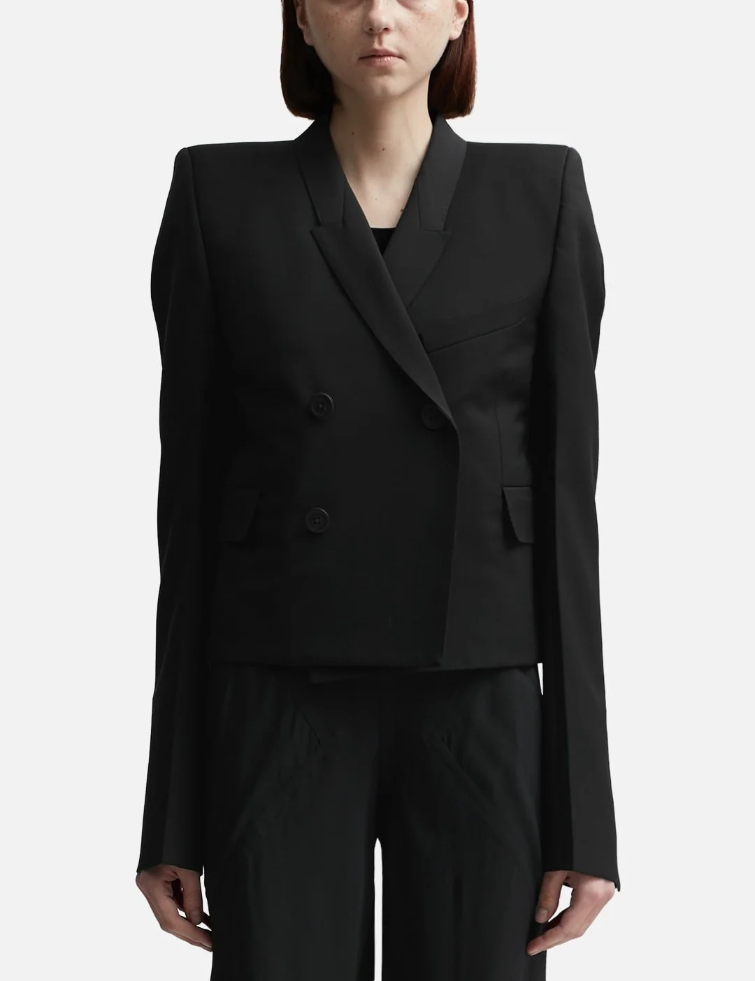 - Rick Owens - Neue Wool Blazer - Slightly cropped cut - Rectangular silhouette - Double-breasted button closure - Buttoned cuffs - Padded shoulder - Single chest pocket - Two front flap pockets - Two interior buttoned pockets - Fully lined - Color: Black - Material: 100% Wool - See more Jackets and Clothing SIZING - Model wears size 40 - Model measures: Height 177cm, Chest 32”/81cm, Waist 23.5”/59.7cm, Hip 33’’/83.8cm