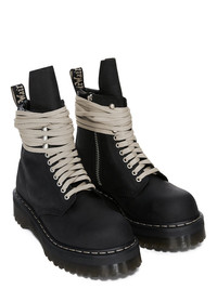 DR. MARTENS X RICK OWENS FW25 QUAD SOLE STEEL TOE BOOT IN OILY NUBUCK COW LEATHER THESE DR. MARTENS BOOTS ARE REIMAGINED BY RICK OWENS AND HAVE PEARL LACING, A STEEL TOE CAP AND PALLADIUM FINISH HARDWARE, INCLUDING EYELETS, HOOKS AND SIDE ZIPPER. THE BOOT FEATURES AN EXTENDED GEOMETRIC TONGUE AND HAS A WOVEN DR. MARTENS AIRWAIR HEEL LOOP IN BLACK AND PEARL. THEY HAVE A QUAD SOLE WITH A PEARL WELT STITCH THIS HEAVYWEIGHT NUBUCK COW LEATHER HAS A FLAT AND MATTE SURFACE FINISH AND AN OILY HANDFEEL PLEASE NOTE THAT THIS MODEL IS NOT CONSIDERED SAFETY FOOTWEAR COLOR: BLACKMATERIAL: UPPER 95% COW LEATHER + 5% POLYURETHANE LEG LINING: 100% COW LEATHER UPPER LINING: 50% NYLON + 50% POLYURETHANE SOLE: 100% POLIVINILCLORURO PLEASE NOTE THE SHOE SIZE LISTED ON THE PRODUCT DESCRIPTION PAGE CORRESPONDS TO UK SHOE SIZE WE STRONGLY RECOMMEND OUR CLIENTS TO CHECK THE SIZE CHART BEFORE PLACING AN ORDER TO AVOID ANY POTENTIAL INCONVENIENCE FEEL FREE TO CONTACT CUSTOMERCARE@RICKOWENS.EU FOR ANY ASSISTANCE