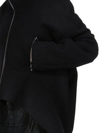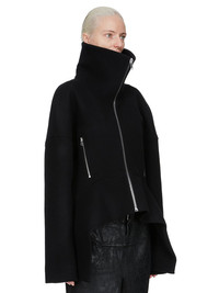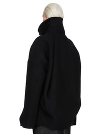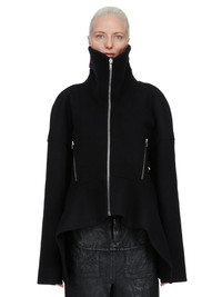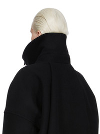RICK OWENS FW25 CONCORDIANS RUNWAY DRACULIMO IN BLACK MELTON THIS DRACULIMO IS BELOW WAIST LENGTH IN FRONT AND LONGER IN THE BACK. IT HAS LONG SLEEVES AND A CENTRE FRONT ZIPPER. IT FEATURES AN EXTENDED LENGTH COLLAR THAT CAN BE WORN UP OR DOWN AND HOLDS ITS SHAPE THANKS TO IT BEING REINFORCED WITH FUSING MATERIAL. IT ALSO FEATURES A FOLD IN THE BACK AND HAS A CURVED, SLIGHTLY LIFTED, FRONT HEM THAT ENDS IN POINTS AT THE SIDES. IT HAS TWO FRONT SIDE ZIPPERED POCKETS THIS HEAVYWEIGHT AND COMPACT WOOL MELTON HAS A FLAT, MATTE FINISH AND A SOFT HANDFEEL COLOR: BLACK MATERIAL: 100% NEW WOOL BODY AND POCKETS LINING 100% COTTON SLEEVES LINING 100% CUPRO MODEL IS 181CM TALL MODEL WEARS SIZE 40
