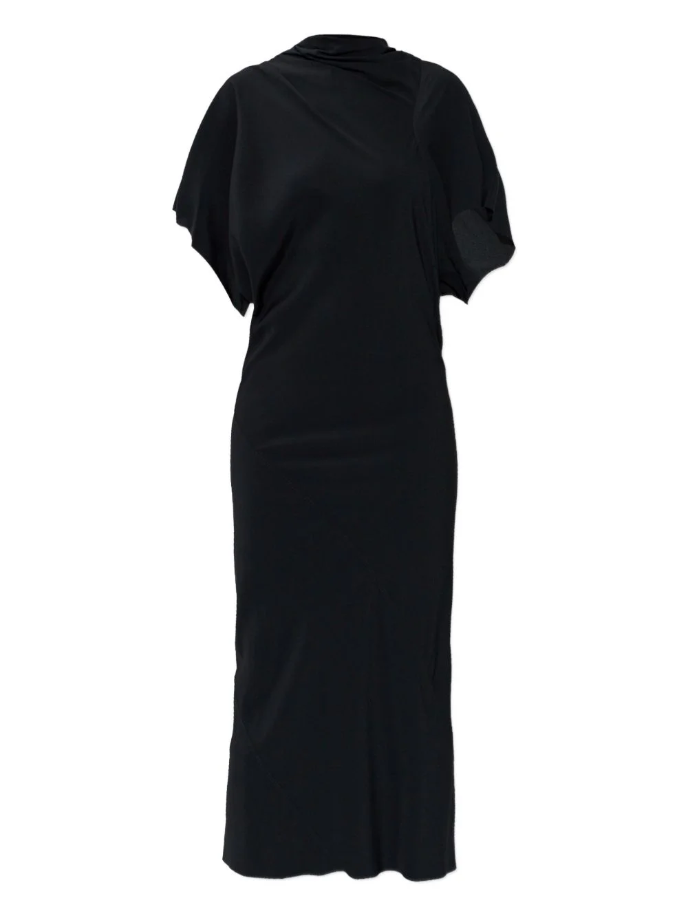 draped asymmetric midi dress Highlights - Black - Draped design - Asymmetric construction - Short sleeves - Midi length - Mock neck Made in Italy Composition Acetate 64%, Silk 36% Washing instructions Read Manufacturer Guidelines