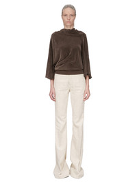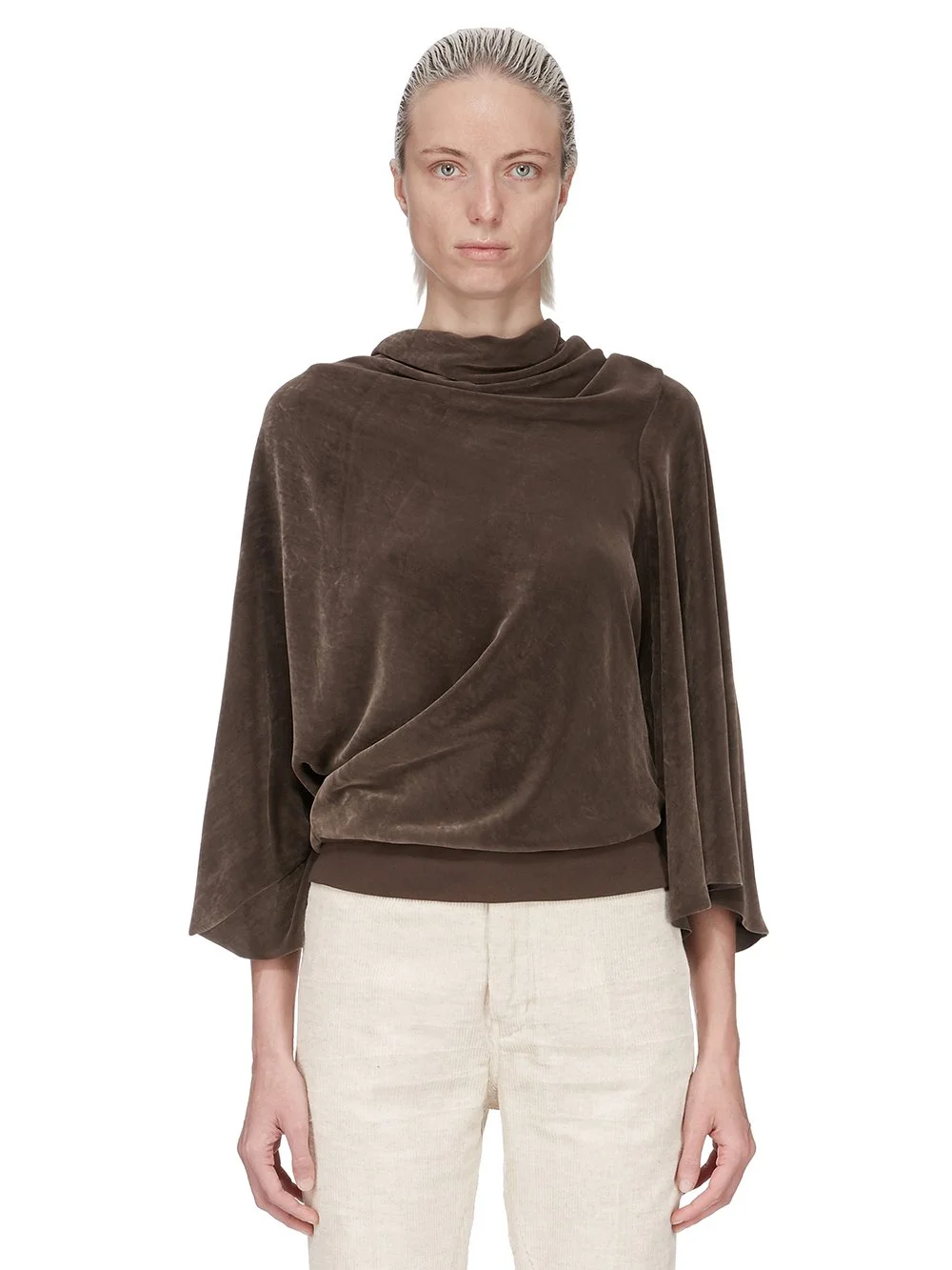 RICK OWENS FW25 CONCORDIANS CYLINDER TOP IN DARKDUST VELVET THIS CYLINDER TOP IS HIP-LENGTH, WITH A DRAPED BIAS CUT BODY, ELBOW-LENGTH WIDE SLEEVES AND A HIGH DRAPED COWL NECK THAT HAS AN ASYMMETRICAL OPENING AT BACK. IT GATHERS INTO THE WAIST AND FINISHES IN A TIGHT BODY TO THE HIP THIS LIGHTWEIGHT AND FLUID VELVET HAS A SOFT AND WASHED UNEVEN FINISH. THIS FABRIC IS MADE FROM CERTIFIED VISCOSE WHICH ENSURES THAT THE FIBERS ARE PRODUCED FROM RESPONSIBLY MANAGED SOURCES AND NO DEFORESTATION OCCURS COLOR: DARKDUST MATERIAL: 82% VISCOSE + 18% SILK BOTTOM 100% COTTON MODEL IS 181CM TALL MODEL WEARS SIZE 40