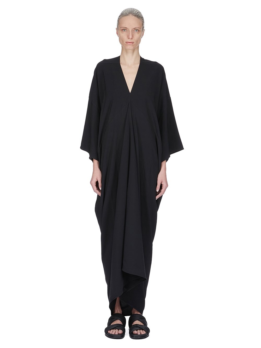 RICK OWENS SS25 HOLLYWOOD TOMMYKITE GOWN IN BLACK COCOON CREPE THIS TOMMYKITE GOWN IS ANKLE LENGTH WITH A SLIGHT RISE IN THE CENTER FRONT HEM. IT FEATURES CENTER FRONT DRAPING, GATHERED INTO A SEAM, THAT COMES TO A POINT BETWEEN THE BUST. IT HAS A V NECK, A DROPPED SHOULDER WITH WIDE THREE QUARTER TOMMY SLEEVES AND A VOLUMINOUS FIT THIS LIGHTWEIGHT AND FLUID SILK BLEND CREPE HAS A DRY AND MATTE FINISH. THIS FABRIC IS MADE FROM FSC® - CERTIFIED (FSC - C162846) ACETATE WHICH ENSURES THAT THE FIBERS ARE PRODUCED FROM RESPONSIBLY MANAGED SOURCES AND NO DEFORESTATION OCCURS COLOR: BLACK MATERIAL: 64% ACETATE + 36% SILK MODEL IS 181CM TALL MODEL WEARS SIZE 40