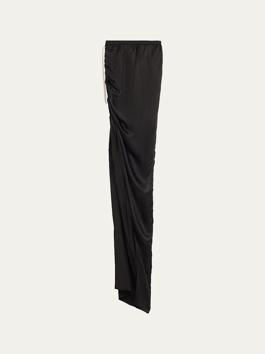Rick Owens skirt featuring drawstring draping followed with a side slit Mid waist Pencil silhouette Full length Pull-on style Cupro Made in Italy Online Inquiries: BGS21_BAAF9| Store Inquiries: #5067653