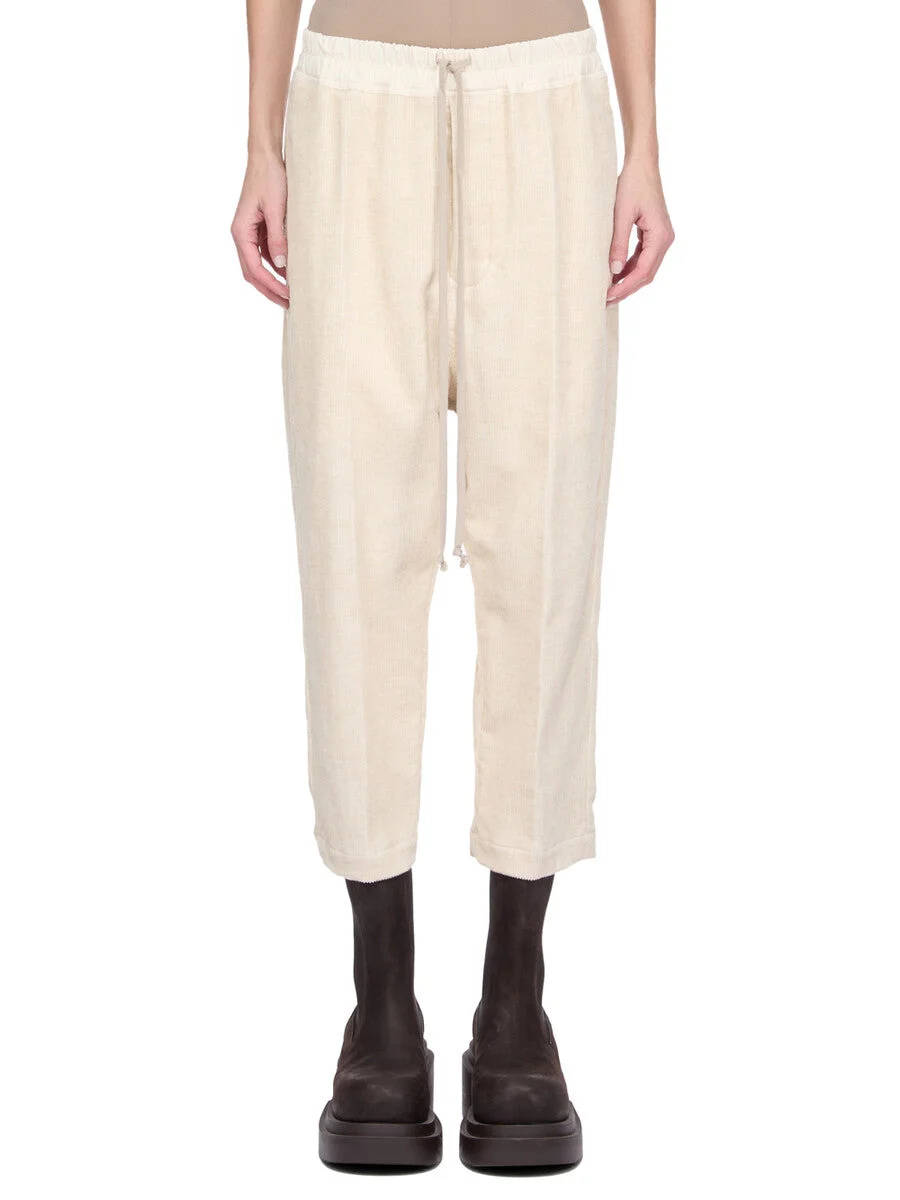 RICK OWENS FW25 CONCORDIANS DRAWSTRING ASTAIRES CROPPED IN NATURAL LINEN CORDUROY THESE DRAWSTRING ASTAIRES CROPPED ARE ABOVE-ANKLE LENGTH, HAVE A SLIGHTLY DROPPED CROTCH AND AN ELASTICIZED WAIST WITH DRAWSTRING. THEY HAVE SIDE POCKETS AND BACK POCKETS WITH FLAPS, AND HAVE PRESSED CREASES ON THE FRONT AND BACK LEG. THE COLOR OF THIS CORDUROY IS NATURAL WITH SLUBS AND IMPURITIES VISIBLE AS A PART OF THE COLORATION. THIS FABRIC IS MADE USING GOTS CERTIFIED ORGANIC COTTON WHICH MEANS THE NATURAL FIBER IS GROWN WITHOUT HARMFUL CHEMICALS, LEAVING OUR SOIL, AIR AND WATER CLEANER FROM CONTAMINATES. COLOR: NATURAL MATERIAL: 74% COTTON + 26% LINEN MODEL IS 181CM TALL MODEL WEARS SIZE 26