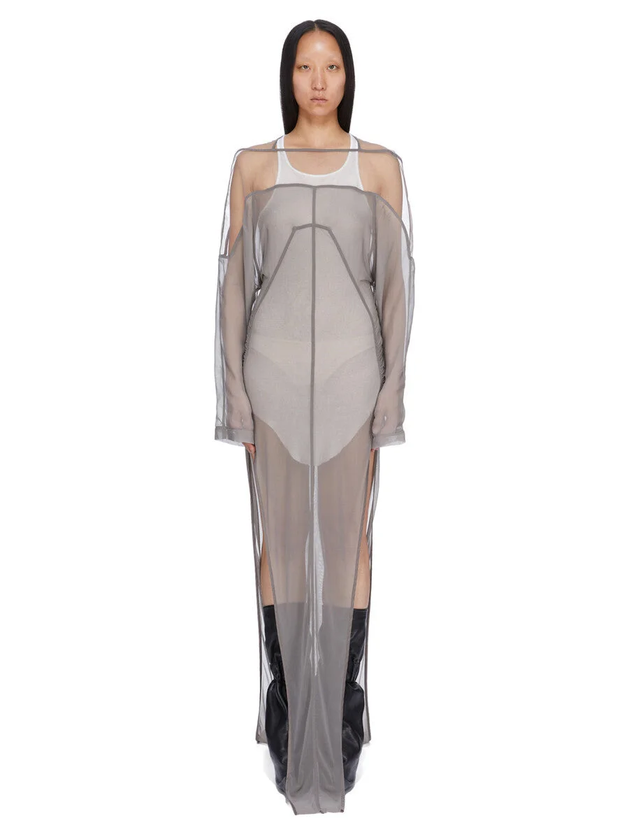 RICK OWENS SS26 TEMPLE COLLAGE GOWN IN DUST STRETCH TULLE, SILK CHIFFON AND TULLE THIS COLLAGE GOWN IS FLOOR LENGTH WITH LONG SLEEVES. IT HAS A BOAT NECK AND LEVEL SHOULDER SEAM AND FRONT AND BACK YOKES THAT CURVE OVER TO FINISH AT BLUNT POINTS ABOVE THE ELBOW. IT FEATURES A CENTRE FRONT AND CENTRE BACK SEAM AND A GEO SEAM LINE, RUNNING ACROSS THE CHEST, AND DIAGONALLY DOWN THE SIDE BODY TO THE HEM. IT HAS A VOLUMINOUS GATHERED BACK THAT CINCHES INTO SIDE RUCHING, HAS SIDE SLITS AND CLOSES WITH BUTTONS AT THE CENTRE BACK NECK. THIS IS A COMBINATION OF STRETCH TULLE, SILK CHIFFON AND TULLE. THIS LIGHTWEIGHT AND SHEER NYLON STRETCH TULLE HAS A SOFT HANDFELL. THIS FABRIC IS MADE USING GRS CERTIFIED RECYCLED POLYAMIDE WHICH ENSURES A REDUCTION IN WATER CONSUMPTION, EMISSIONS AND HAZARDOUS WASTE, LESSENING THE DEPENDENCE ON NON-RENEWABLE RESOURCES. COLOR: DUST MATERIAL: 93% NYLON + 7% ELASTANE YOKE 100% NYLON SLEEVES 100% SILK MODEL IS 181CM TALL MODEL WEARS SIZE 40