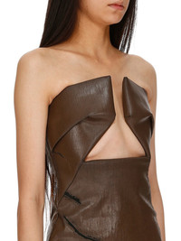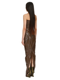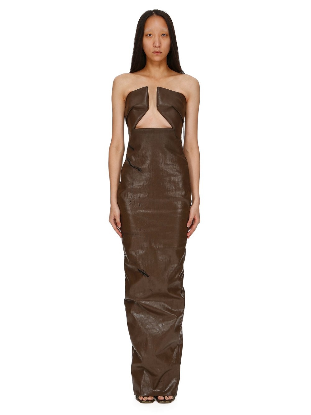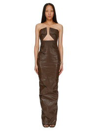 RICK OWENS FW23 LUXOR PRONG GOWN IN BROWN CRACKED STRETCH DENIM THIS PRONG GOWN IS FLOOR LENGTH AT FRONT. IT FEATURES A STRAPLESS STRUCTURED BODICE WITH A BONED GEOMETRIC CUTOUT FRONT AND FOLDED BUST DETAIL. IT HAS A TIGHT FITTING SKIRT WHICH TAPERS SLIGHTLY TO THE ANKLE WITH A HIGH CENTRE BACK SPLIT, AND EXPOSED ZIPPER CLOSURE THIS LIGHTWEIGHT STRETCH DENIM HAS A SOFT, MATTE FILM OVERLAY. AFTER THE DENIM BASE IS OVER DYED AND COATED WITH A DARK GLUE, THE FILM IS APPLIED BY HEAT PRESS AND TUMBLED TO CREATE THE SOFT HAND FEEL AND CRACKED EFFECT. SINCE THE FILM IS APPLIED DIRECTLY ON THE READY GARMENT, SEAMS AND DETAILS MAKE THE APPLICATION IRREGULAR, EXPOSING THE UNDERLYING DENIM IN CERTAIN AREAS. THIS IS AN INHERENT CHARACTERISTIC OF THIS TYPE OF TREATMENT AND IS A DESIRED VISUAL ASPECT WHICH MAKES EACH PIECE UNIQUE - COLOR: BROWN - MATERIAL: 91% COTTON + 6% ELASTOMULTIESTER + 3% RUBBER - INNER BUSTIER 97% COTTON + 3% ELASTANE - MODEL IS WEARING SIZE 40 - MODEL IS 181 CM TALL