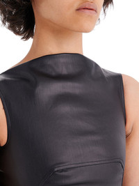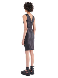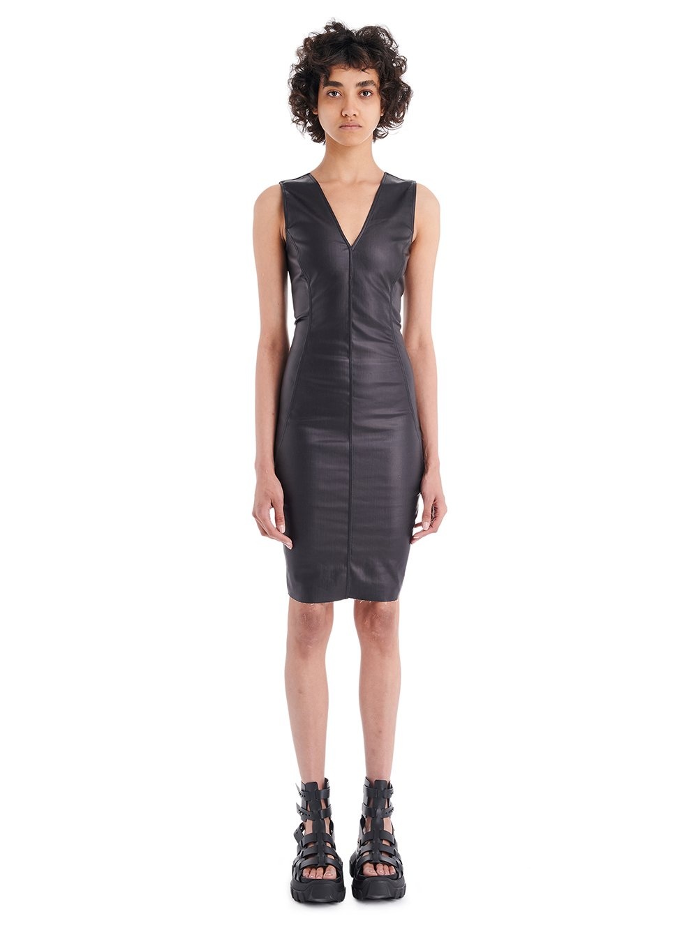 RICK OWENS SS22 FOGACHINE STRETCH V DRESS IN BLACK MATTE STRETCH DENIM THIS STRETCH V DRESS IS ABOVE KNEE LENGTH AND SLEEVELESS WITH A TIGHT FIT. IT FEATURES V NECK AND SIDE FRONT SEAMS WITH TOPSTICHING. IT HAS A V BACK WITH EXPOSED CENTRE ZIP WHICH FINISHES INTO A HOTIZONTAL SEAM LINE AND A WRAP SKIRT WITH A SIDE SPLIT CONCEALED BENEATH THE FLAP THIS LIGHTWEIGHT STRETCH DENIM HAS A WATER-BASED BLACK MATTE FILM FINISH - COLOR: BLACK - MATERIAL: 91% COTTON + 6% ELASTOMULTIESTERE + 3% RUBBER - MODEL IS WEARING SIZE 40 - MODEL IS 181 CM TALL