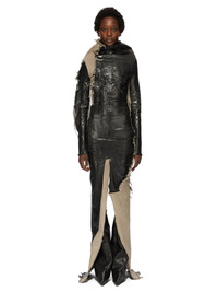 RICK OWENS FW25 CONCORDIANS RUNWAY ETNA DRESS IN BLACK/NATURAL BLACK MEGACRUST STRETCH DENIM AND NATURAL STRETCH DENIM THIS ETNA DRESS IS FLOOR LENGTH AT THE SIDES WITH A CLOSE TO THE BODY FIT. IT FEATURES A WIDE, HIGH DRAPED NECK AT FRONT, THAT WIDENS INTO AN OPEN BACK NECK, AND HAS A ZIPPER DOWN TO THE BUTT. IT HAS LONG, FITTED SLEEVES AND FEATURES TWO HIGH SLITS FRONT AND BACK AS WELL AS A FRONT AND BACK STITCH RIDGE DETAIL. THIS IS A COMBINATION OF BLACK MEGACRUST STRETCH DENIM AND NATURAL STRETCH DENIM THIS LIGHTWEIGHT STRETCH MEGACRUST DENIM IS GARMENT DYED BLACK AND TREATED WITH A WAX FINISH, THEN SEVERAL LAYERS OF BLACK FOIL IS PRESSED ON TOP AND A FINAL WASH MAKES THE FOIL PEEL AND CRACK THE NATURAL ASPECTS OF THIS TREATMENT MEANS THE FOIL HAS PEELED OFF AND CRACKED IN CERTAIN AREAS AND WILL CONTINUE TO DO SO WITH WEAR AND ABRASION. THIS IS AN INHERENT CHARACTERISTIC OF THIS TYPE OF TREATMENT AND IS A DESIRED A VISUAL ASPECT WHICH ADDS TO THE UNIQUENESS OF EACH PIECE THIS GARMENT IS TREATED IN AN ITALIAN WASH HOUSE BASED IN THE VENETO AREA OF ITALY, THAT PRODUCES IN SMALLER TREATMENT BATHS TO REDUCE WATER WASTE AND UTILIZE A WATER PURIFYING PROCESS THAT ENABLES THEM TO RECYCLE A PORTION OF THE WATER USED. ALL OF OUR DENIM WASHES ARE ZDHC CERTIFIED COLOR: BLACK/NATURAL MATERIAL: 91% COTTON + 6% ELASTOMULTIESTER + 3% RUBBER FIBER DETAILS 85% COTTON + 10% POLYESTER + 5% ELASTANE MODEL IS 181CM TALL MODEL WEARS SIZE 38