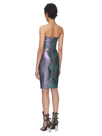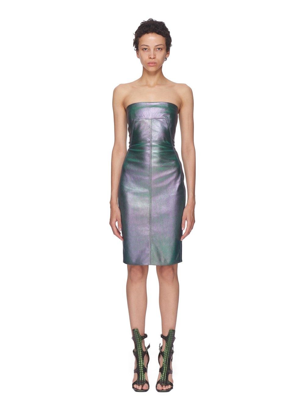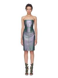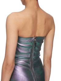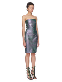 RICK OWENS SS23 EDFU BUSTIER DRESS IN IRIDESCENT STRETCH LAMB LEATHER THIS BUSTIER DRESS IS ABOVE KNEE LENGTH WITH A CLOSE TO THE BODY FIT. IT IS A STRAPLESS BUSTIER TOP WITH A SIGNATURE GEO SEAM RUNNING ACROSS THE FRONT CHEST AND SLANTING DIAGONALLY DOWN THE SIDE BODY. IT HAS A CENTRE BACK ZIPPER AND A RAW HEM THIS STRETCH LEATHER HAS A MULTI-TONAL IRIDESCENT METALLIC FINISH AND IS PRODUCED IN A SMALL TANNERY IN THE SOUTH OF FRANCE - COLOR: IRIDESCENT - MATERIAL: 65% LAMB LEATHER + 34% COTTON + 1% SPANDEX - INNER BUSTIER 78% NYLON + 22% ELASTANE - MODEL IS WEARING SIZE 40 - MODEL IS 181 CM TALL