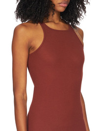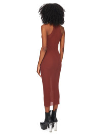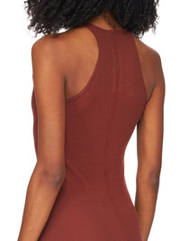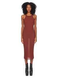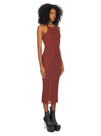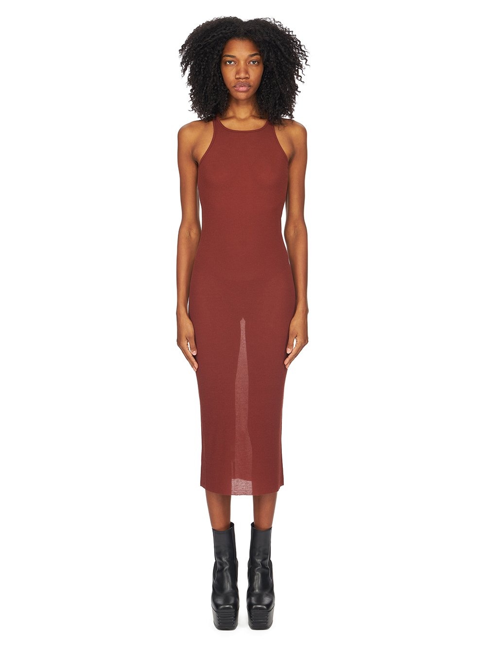RICK OWENS SS24 LIDO TANK DRESS IN HENNA BROWN VISCOSE SILK RIB JERSEY THIS TANK DRESS IS BELOW KNEE LENGTH WITH A CLOSE TO THE BODY FIT. IT HAS A ROUND NECKLINE AND THIN SHOULDER STRAPS THAT FLOW INTO A SLIGHT RACER BACK. IT HAS A RAW CUT HEM AND FEATURES THE SIGNATURE SINGLE SEAM RUNNING DOWN THE CENTRE BACK SPINE THIS LIGHTWEIGHT VISCOSE AND SILK RIB JERSEY HAS A DISTINCT RIB PATTERN AND SOFT HANDFEEL. THIS JERSEY IS MADE FROM FSC® CERTIFIED VISCOSE WHICH ENSURES THAT THE FIBERS ARE PRODUCED FROM RESPONSIBLY MANAGED SOURCES AND NO DEFORESTATION OCCURS. WE STRIVE TO KEEP OUR PRODUCTION AS LOCAL AS POSSIBLE. THE FULL MANUFACTURING CYCLE OF THIS PRODUCT, FROM THE MATERIAL KNITTING TO SEWING AND FINISHING, WAS UNDERTAKEN CLOSE TO OUR HOME BASE IN CONCORDIA, ITALY -COLOR: HENNA BROWN -MODEL IS 181CM TALL -MODEL WEARS SIZE 40