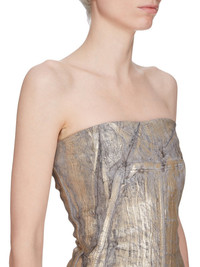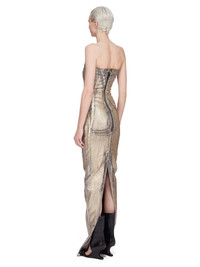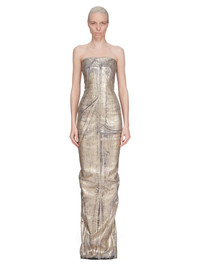 RICK OWENS SS25 HOLLYWOOD BUSTIER GOWN IN GOLD MEGACRUST STRETCH DENIM THIS BUSTIER GOWN IS FLOOR-LENGTH WITH A CLOSE TO THE BODY FIT. IT HAS A STRAPLESS BUSTIER TOP, WITH A SIGNATURE GEO SEAM RUNNING ACROSS THE FRONT CHEST, AND SLANTING DIAGONALLY DOWN THE SIDE BODY. IT HAS A CENTER BACK ZIPPER AND A TAPERED SKIRT WITH A SPLIT IN THE CENTER BACK SEAM, UP TO THE KNEE, AND A RAW CUT HEM THIS LIGHTWEIGHT GOLD MEGACRUST STRETCH DENIM IS MADE ON A 10OZ BLACK AND NATURAL STRETCH DENIM. THE READY GARMENT IS OVERDYED DUST AND THEN TREATED WITH LAYERS OF GOLD COLORED FOIL THAT IS PRESSED ON BY HAND. THE NATURAL ASPECTS OF THIS TREATMENT MEANS THE FOIL APPLICATION IS IRREGULAR AND HAS PEELED OFF AND CRACKED IN CERTAIN AREAS AND WILL CONTINUE TO DO SO WITH WEAR AND ABRASION. THIS IS AN INHERENT CHARACTERISTIC OF THIS TYPE OF TREATMENT AND IS A DESIRED A VISUAL ASPECT WHICH ADDS TO THE UNIQUENESS OF EACH PIECE. THIS GARMENT IS TREATED IN AN ITALIAN WASH HOUSE BASED IN THE VENETO AREA OF ITALY, THAT PRODUCES IN SMALLER TREATMENT BATHS TO REDUCE WATER WASTE AND UTILIZE A WATER PURIFYING PROCESS THAT ENABLES THEM TO RECYCLE A PORTION OF THE WATER USED. ALL OF OUR DENIM WASHES ARE ZDHC CERTIFIED COLOR: GOLD MATERIAL: 91% COTTON + 6% ELASTOMULTIESTER + 3% RUBBER INNER BUSTIER 84% NYLON + 16% ELASTANE MODEL IS 181CM TALL MODEL WEARS SIZE 38