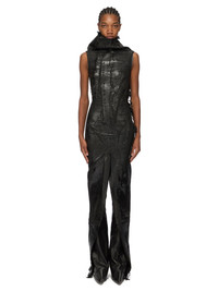 RICK OWENS FW25 CONCORDIANS RUNWAY SL ETNA DRESS IN BLACK BLACK MEGACRUST STRETCH DENIM THIS SL ETNA DRESS IS FLOOR LENGTH AT THE SIDES WITH A CLOSE TO THE BODY FIT. IT FEATURES A WIDE, HIGH DRAPED NECK AT FRONT, THAT WIDENS INTO AN OPEN BACK NECK, AND HAS A ZIPPER DOWN TO THE BUTT. IT IS SLEEVELESS AND FEATURES TWO HIGH SLITS FRONT AND BACK AS WELL AS A FRONT AND BACK STITCH RIDGE DETAIL. THIS LIGHTWEIGHT STRETCH MEGACRUST DENIM IS GARMENT DYED BLACK AND TREATED WITH A WAX FINISH, THEN SEVERAL LAYERS OF BLACK FOIL IS PRESSED ON TOP AND A FINAL WASH MAKES THE FOIL PEEL AND CRACK THE NATURAL ASPECTS OF THIS TREATMENT MEANS THE FOIL HAS PEELED OFF AND CRACKED IN CERTAIN AREAS AND WILL CONTINUE TO DO SO WITH WEAR AND ABRASION. THIS IS AN INHERENT CHARACTERISTIC OF THIS TYPE OF TREATMENT AND IS A DESIRED A VISUAL ASPECT WHICH ADDS TO THE UNIQUENESS OF EACH PIECE THIS GARMENT IS TREATED IN AN ITALIAN WASH HOUSE BASED IN THE VENETO AREA OF ITALY, THAT PRODUCES IN SMALLER TREATMENT BATHS TO REDUCE WATER WASTE AND UTILIZE A WATER PURIFYING PROCESS THAT ENABLES THEM TO RECYCLE A PORTION OF THE WATER USED. ALL OF OUR DENIM WASHES ARE ZDHC CERTIFIED COLOR: BLACK MATERIAL: 91% COTTON + 6% ELASTOMULTIESTER + 3% RUBBER FIBER MODEL IS 181CM TALL MODEL WEARS SIZE 38